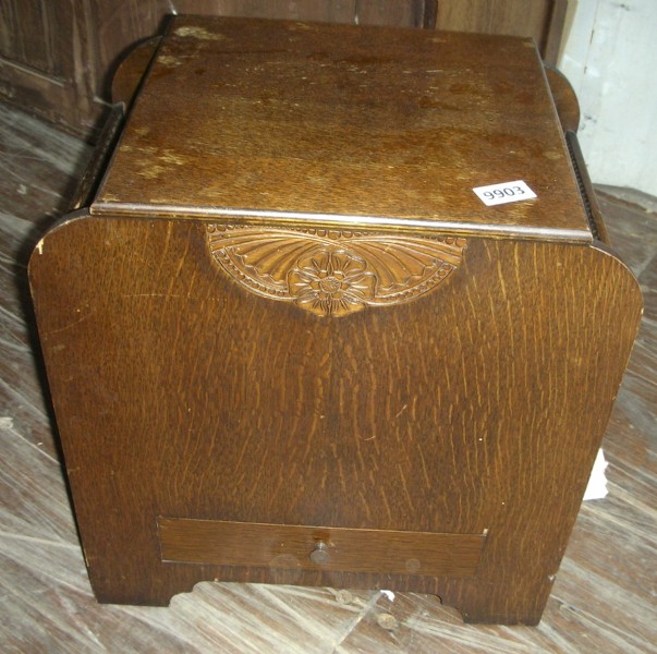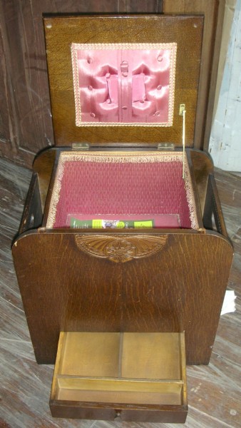 An Art Deco English oak Sewing box magazine rack, the top hinges up to expose the padded and lined interior. There is a single drawer below with carved floral medallion above and magazine storage on either side.