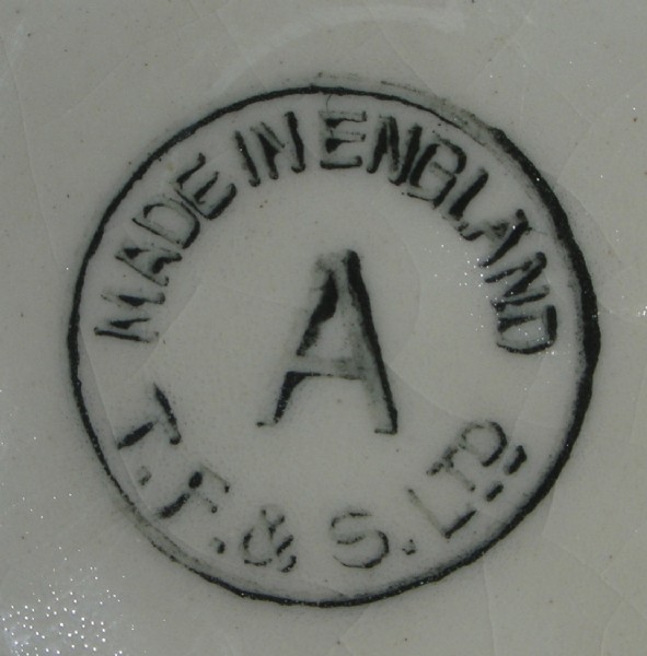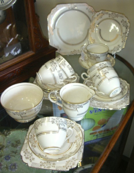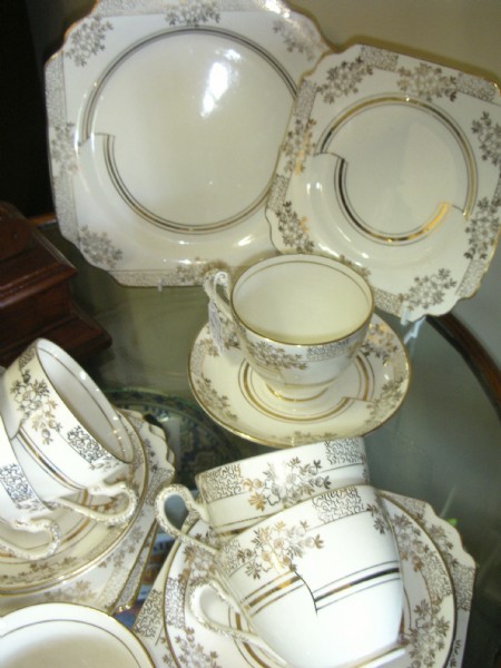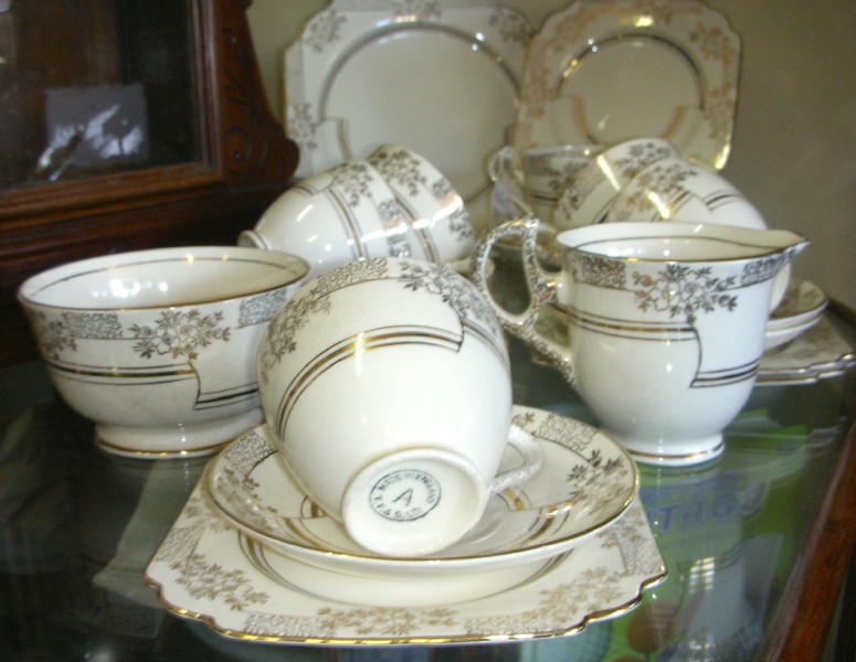 A six piece Art Deco ceramic tea set including large cake plate, sugar bowl and milk jug. The geometric guilt pattern over an ivory ground. Made in England By T.F. & S LTD.