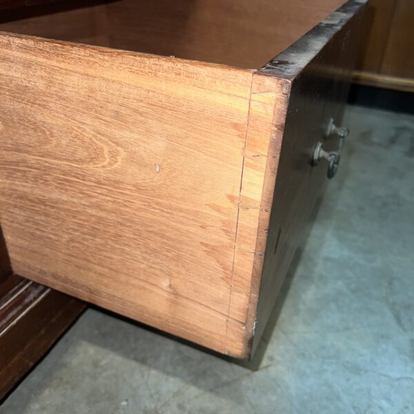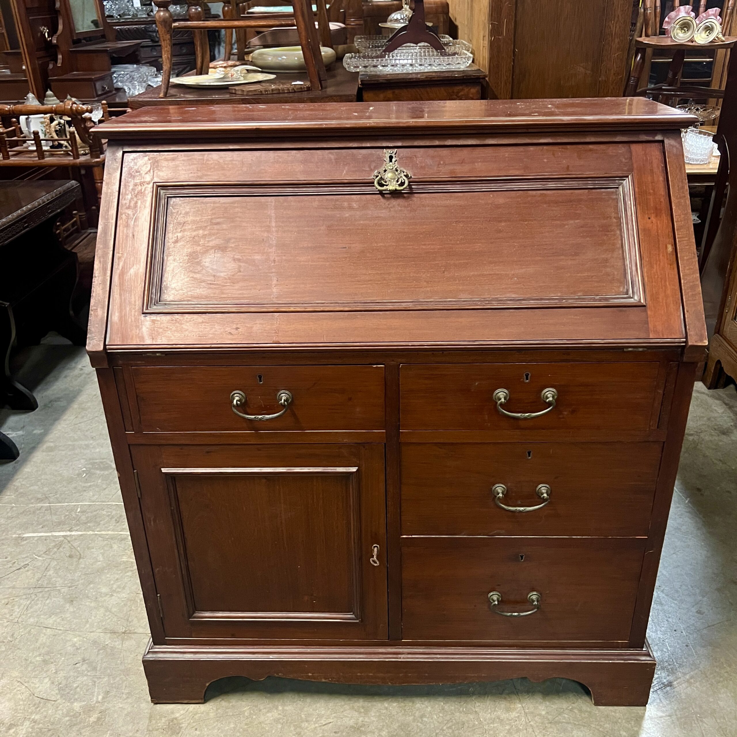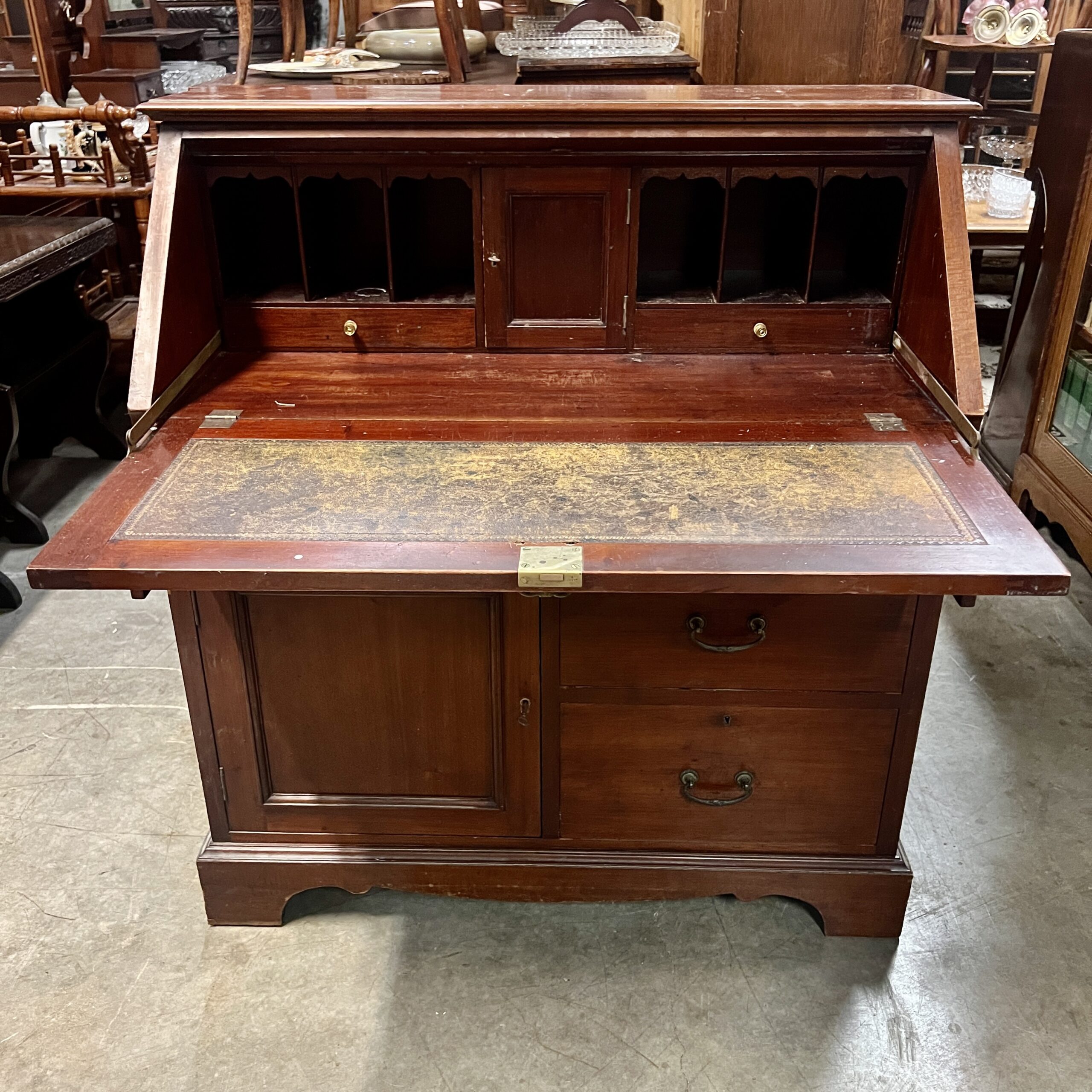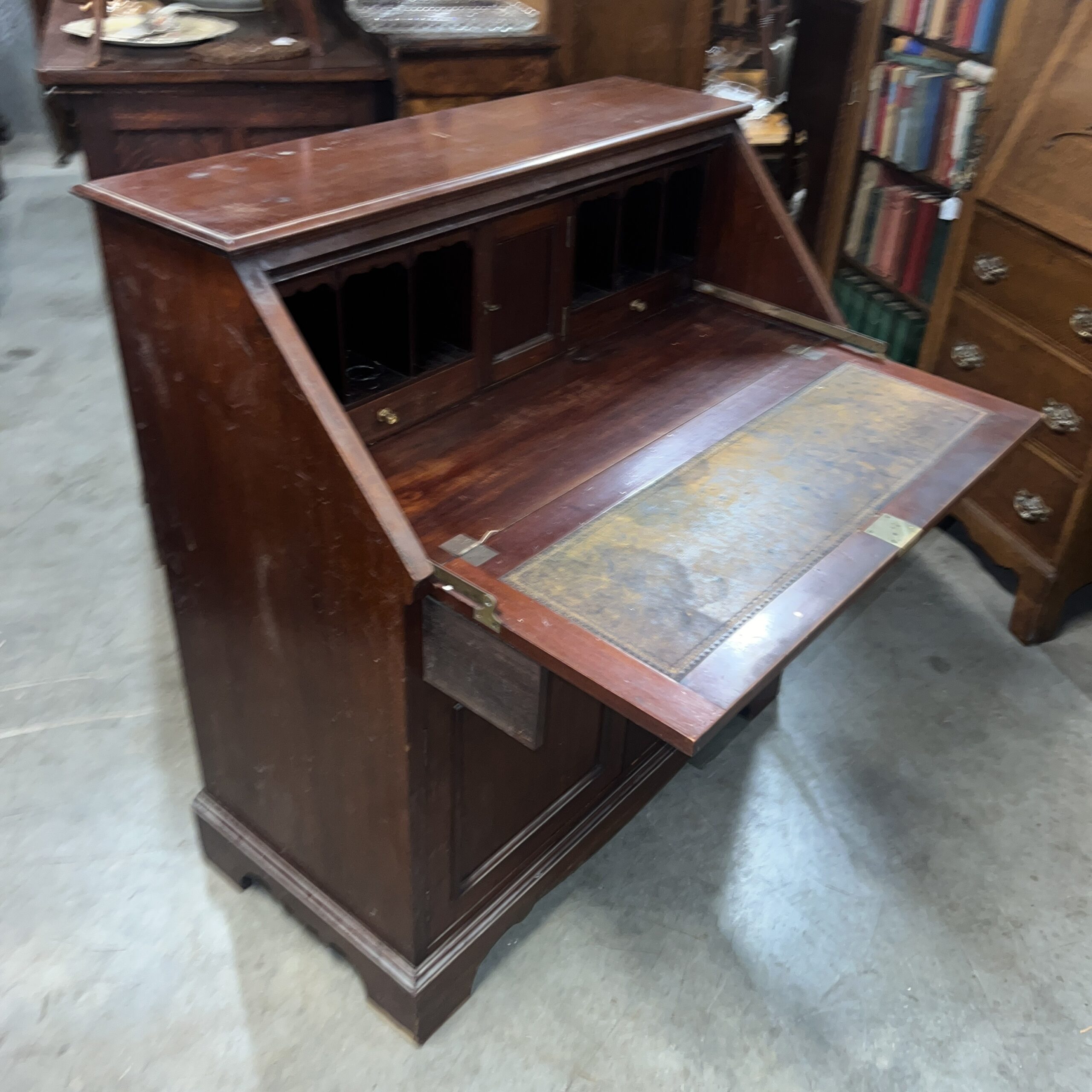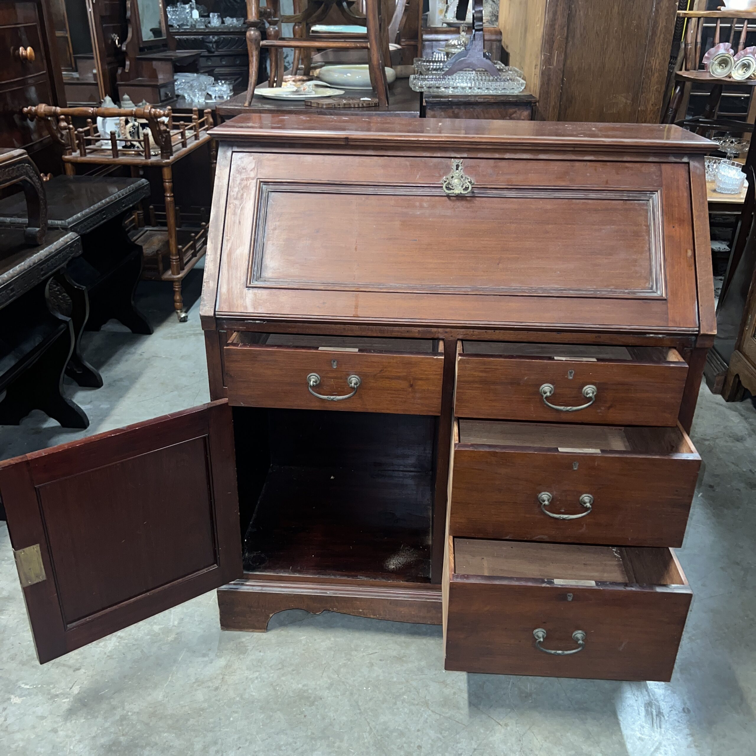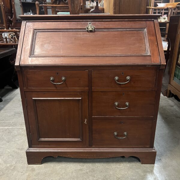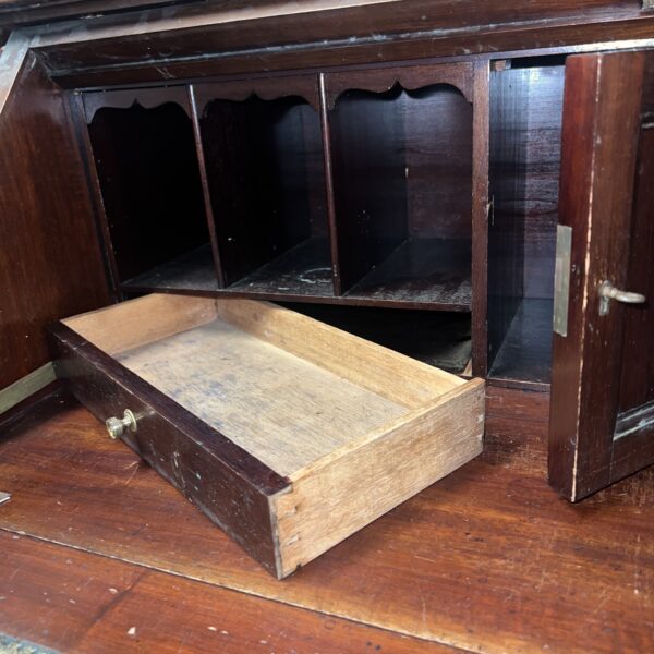 An Australian Cedar bureau the fall has a leather look insert and encloses a series of pigeon holes, small drawers and a lockable door. The bottom has four half width drawers all constructed with fine hand cut dovetails and a single door. Restored – $1495