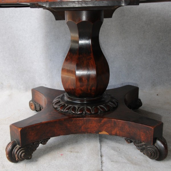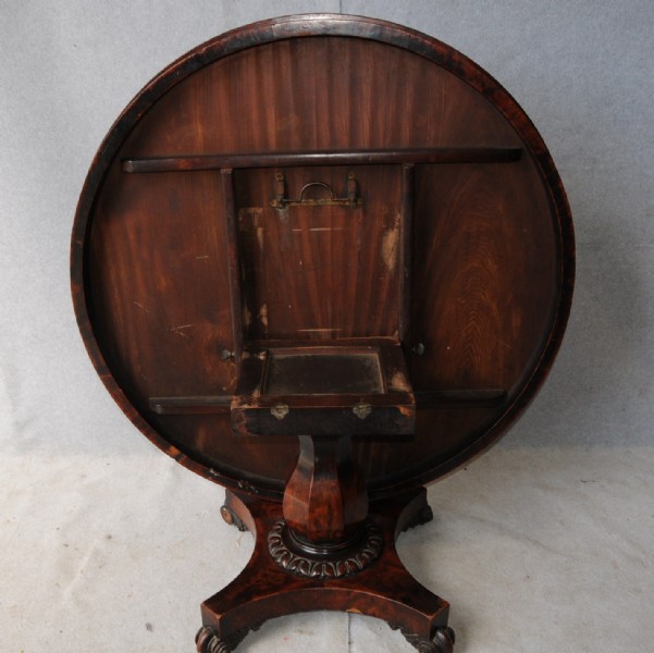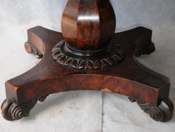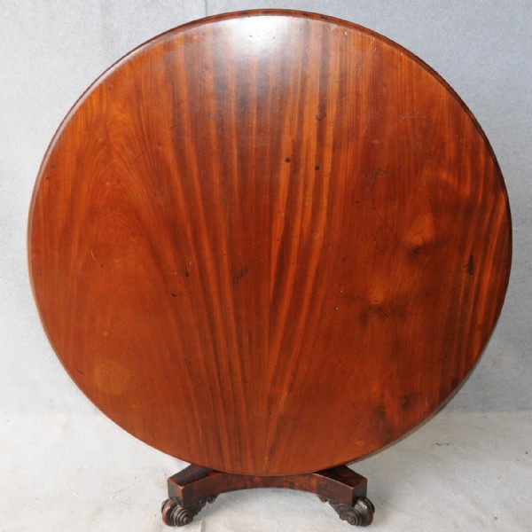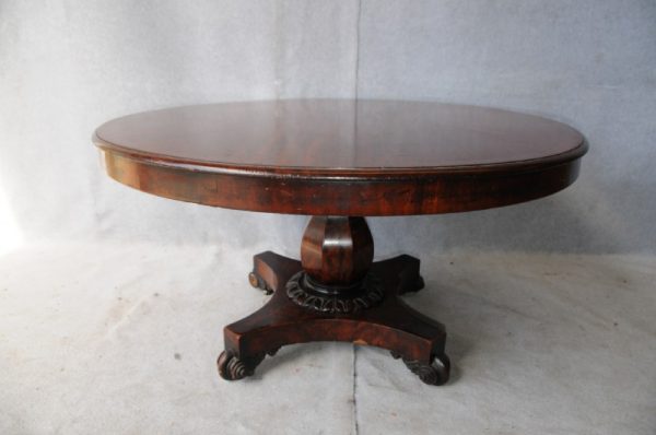 A superb piece of Australiana, this early 19thc circular cedar tilt top dining table raised on a single central octagonal support with carved and scrolling platform base. A great investment in Australian history. Size: 132cm in diameter x 69cm high.