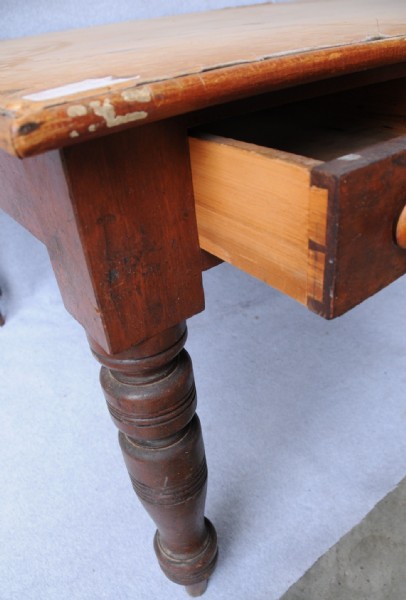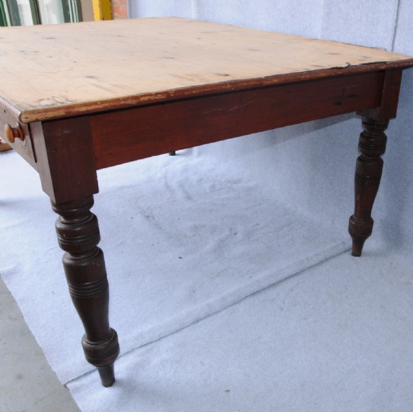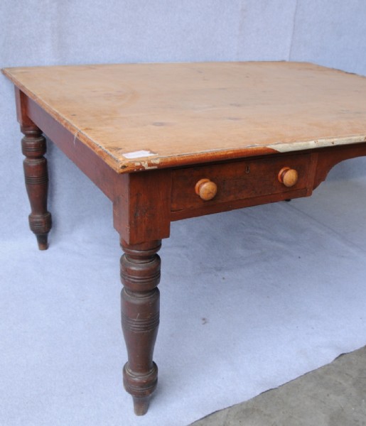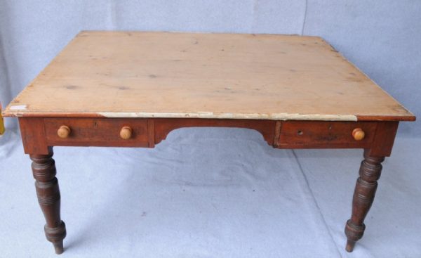A large jarrah Australian colonial desk with two drawers. Raised on turned legs, the desk top requires a tooled leather top that wraps around the edges and is finished with mitred jarrah beading.