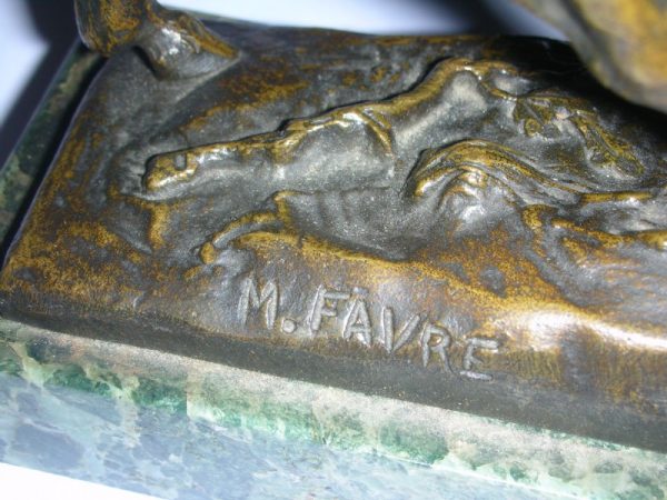 A late 19th century bronze model of a stag signed Maurice Favre (1875-1915) on green marble base.