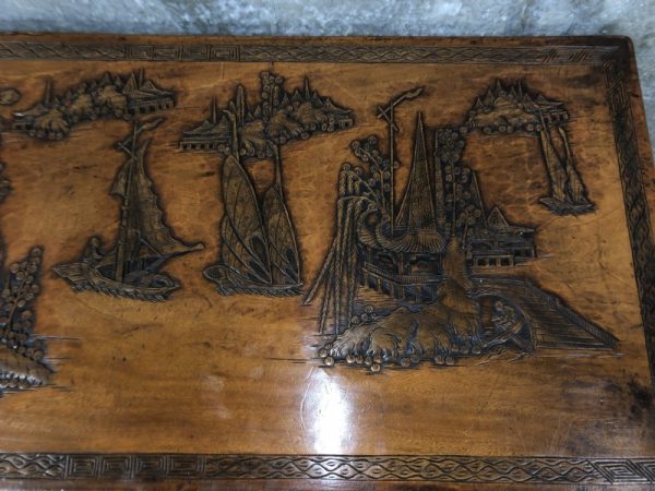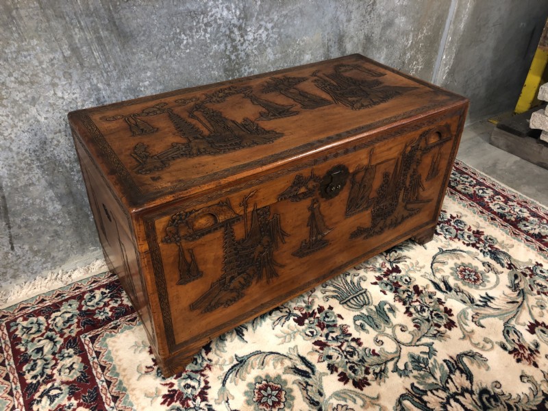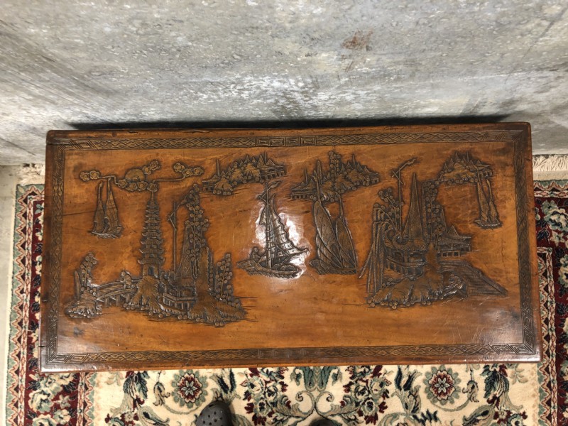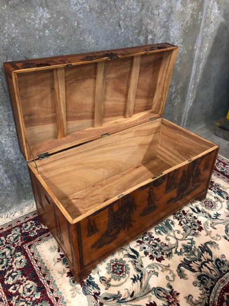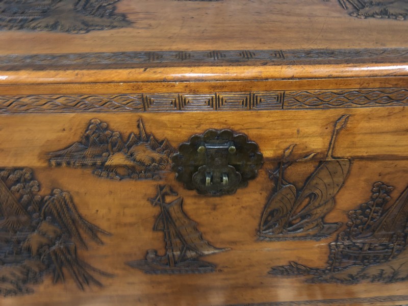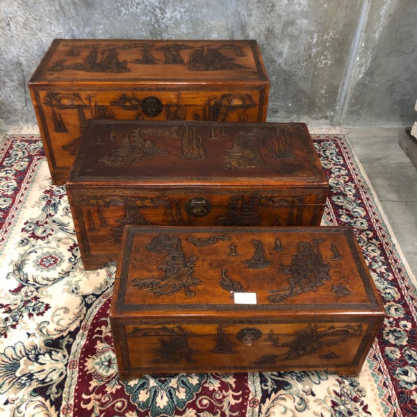 A set of three graduating in size carved camphor wood trunks with ship decoration