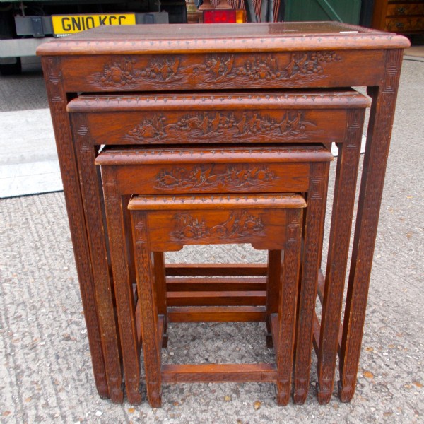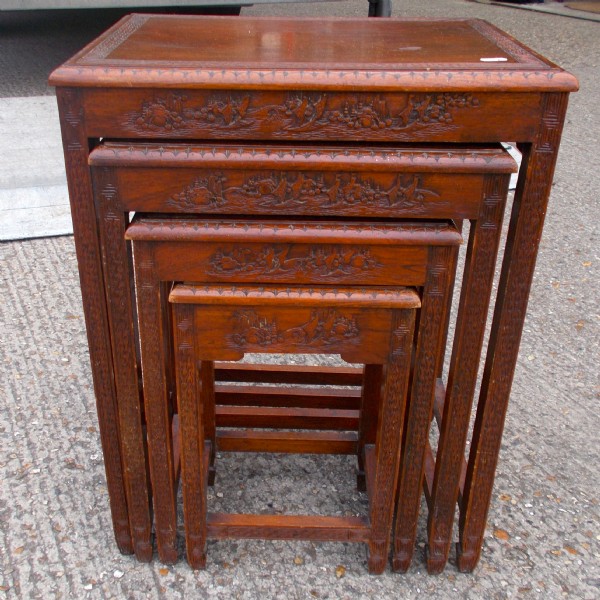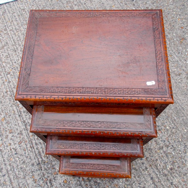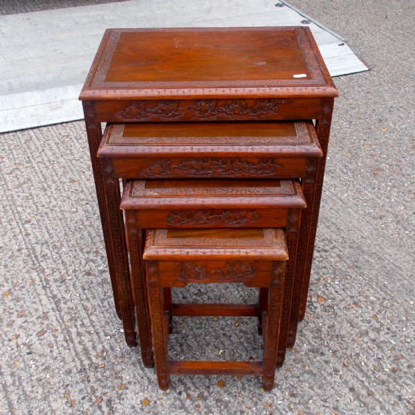 An early 20th century Chinese carved hardwood nest of four occasional tables, largest 51cm