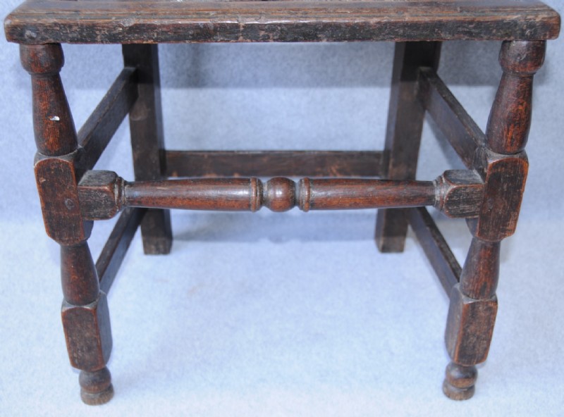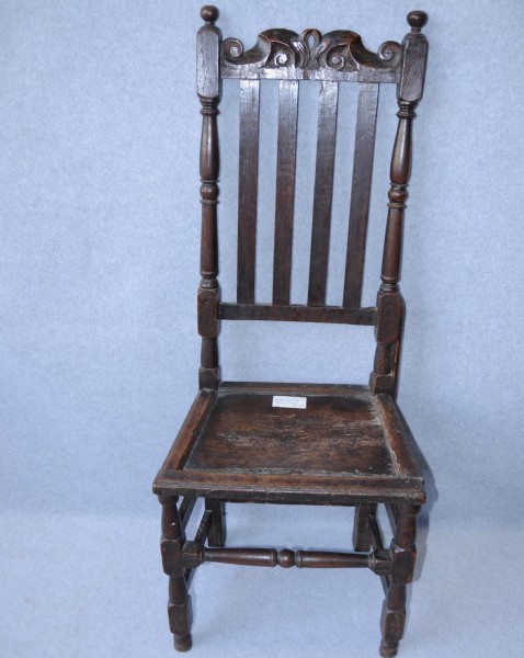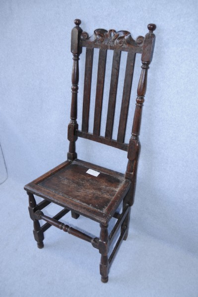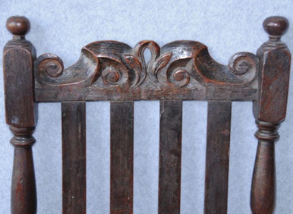 A Cromwellian oak high back chair that has turned sides and a carved top rail with slats. The chair stands on turned legs with stretcher. There are some replaced timbers.