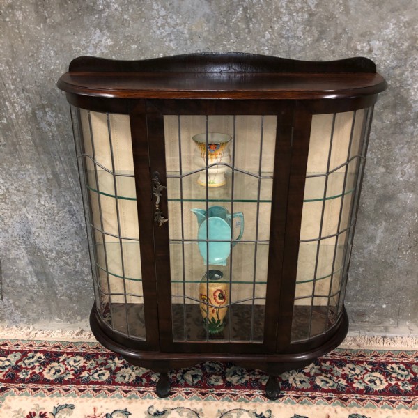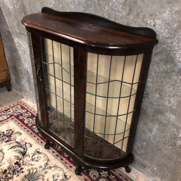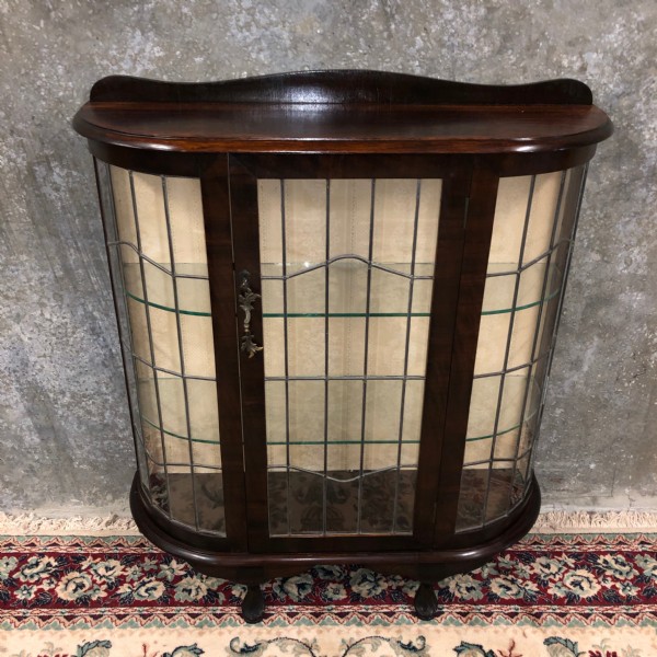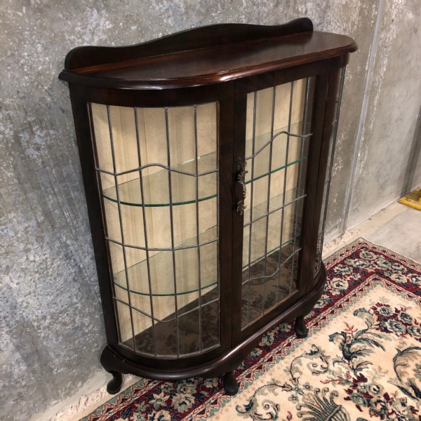Art Deco display cabinet with decorative lead light doors and curved side panels with two internal glass shelves