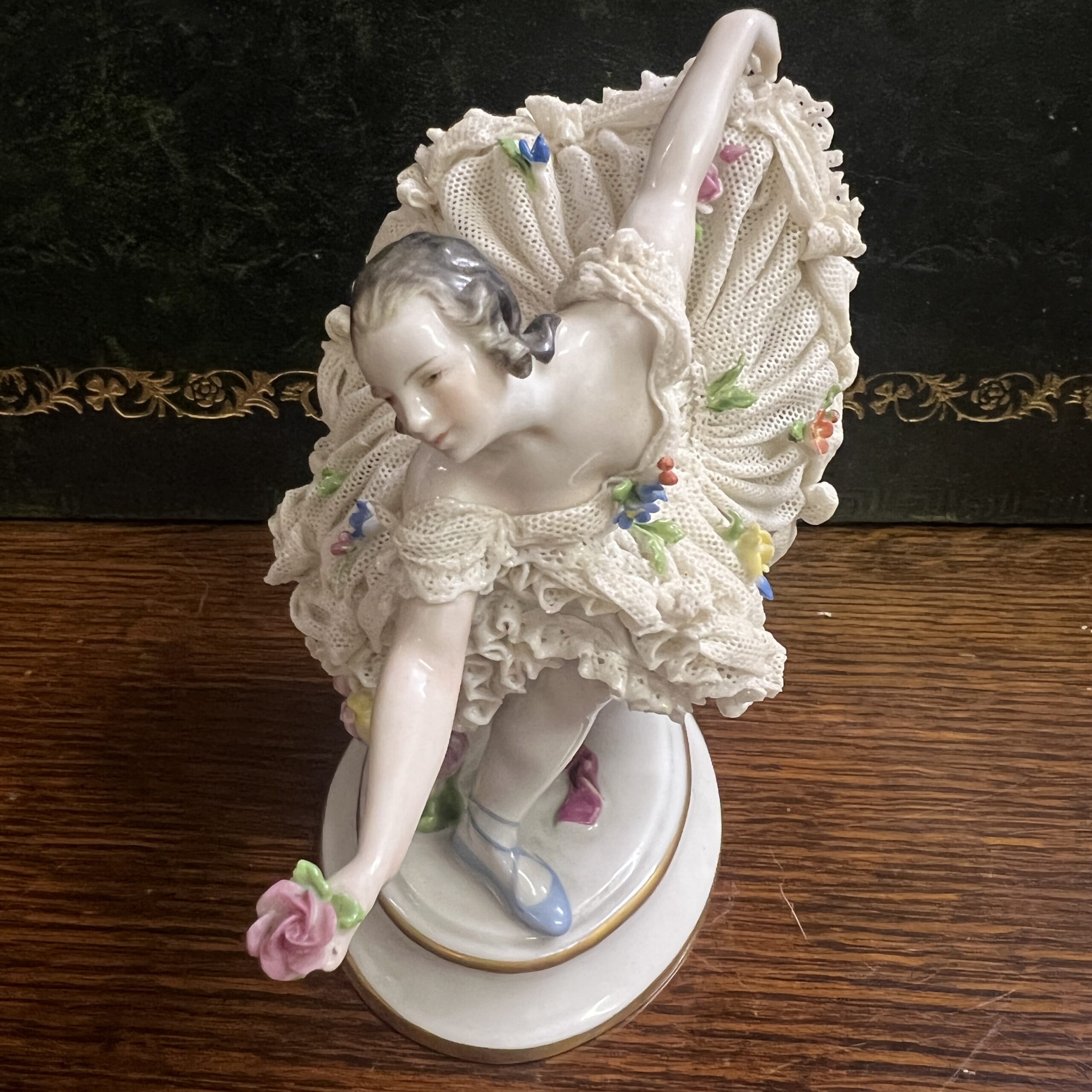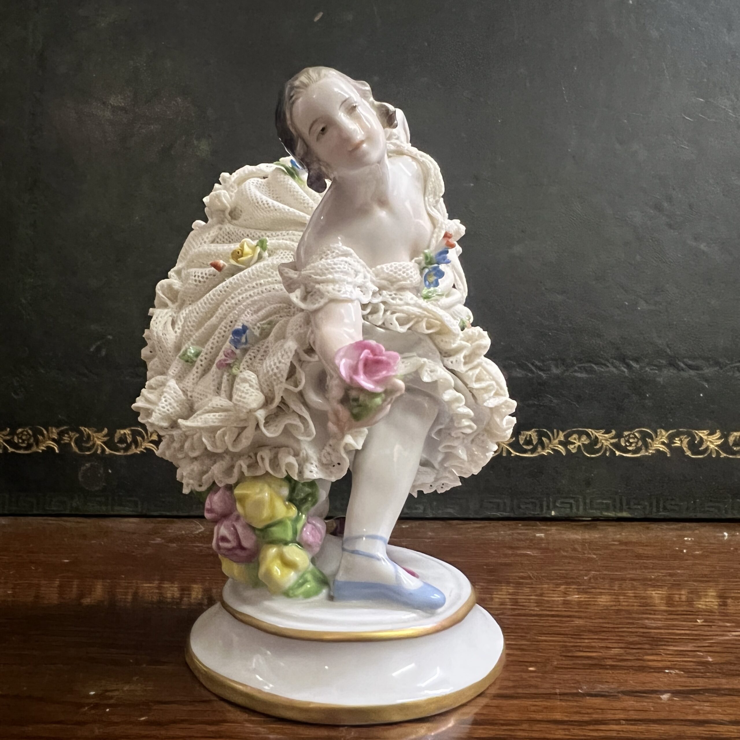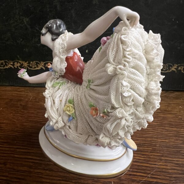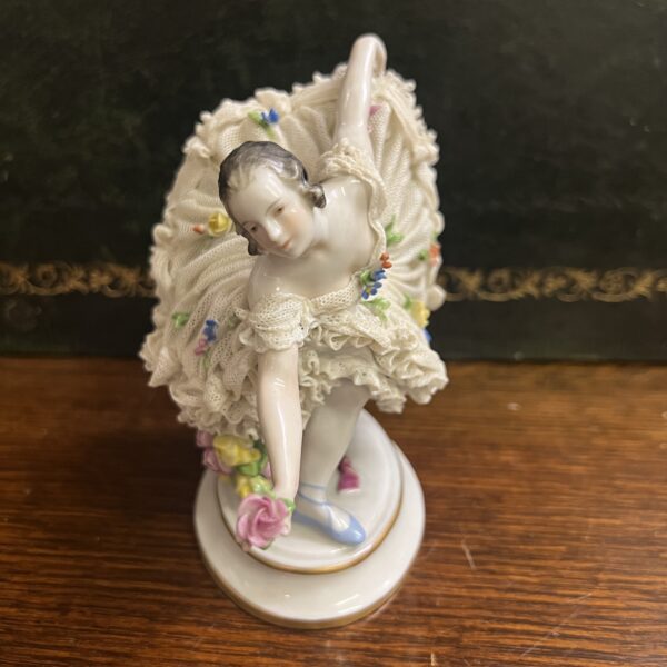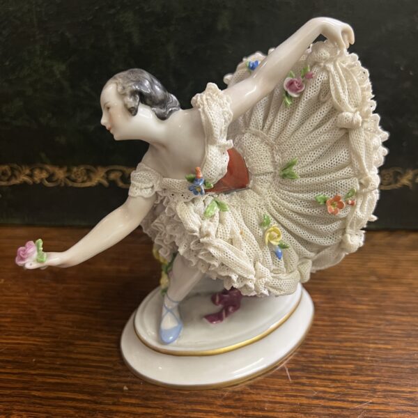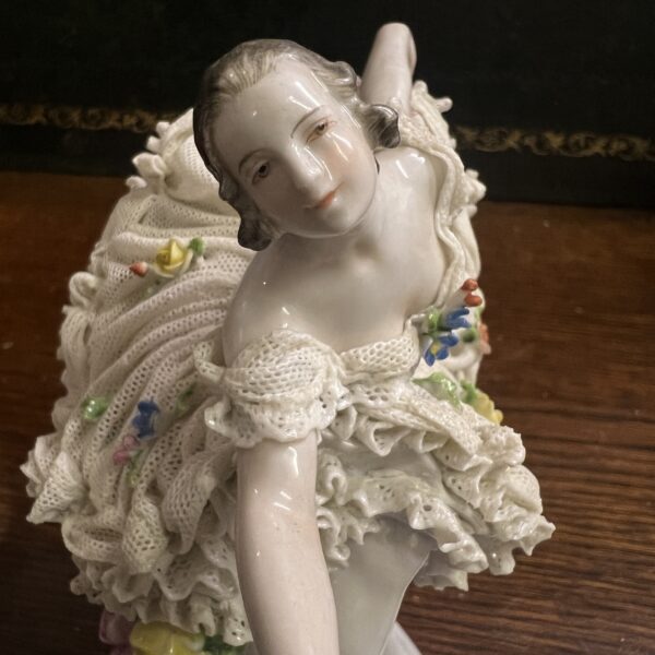 An early 20th century Dresden porcelain lacework curtseying ballerina adorned with flowers
