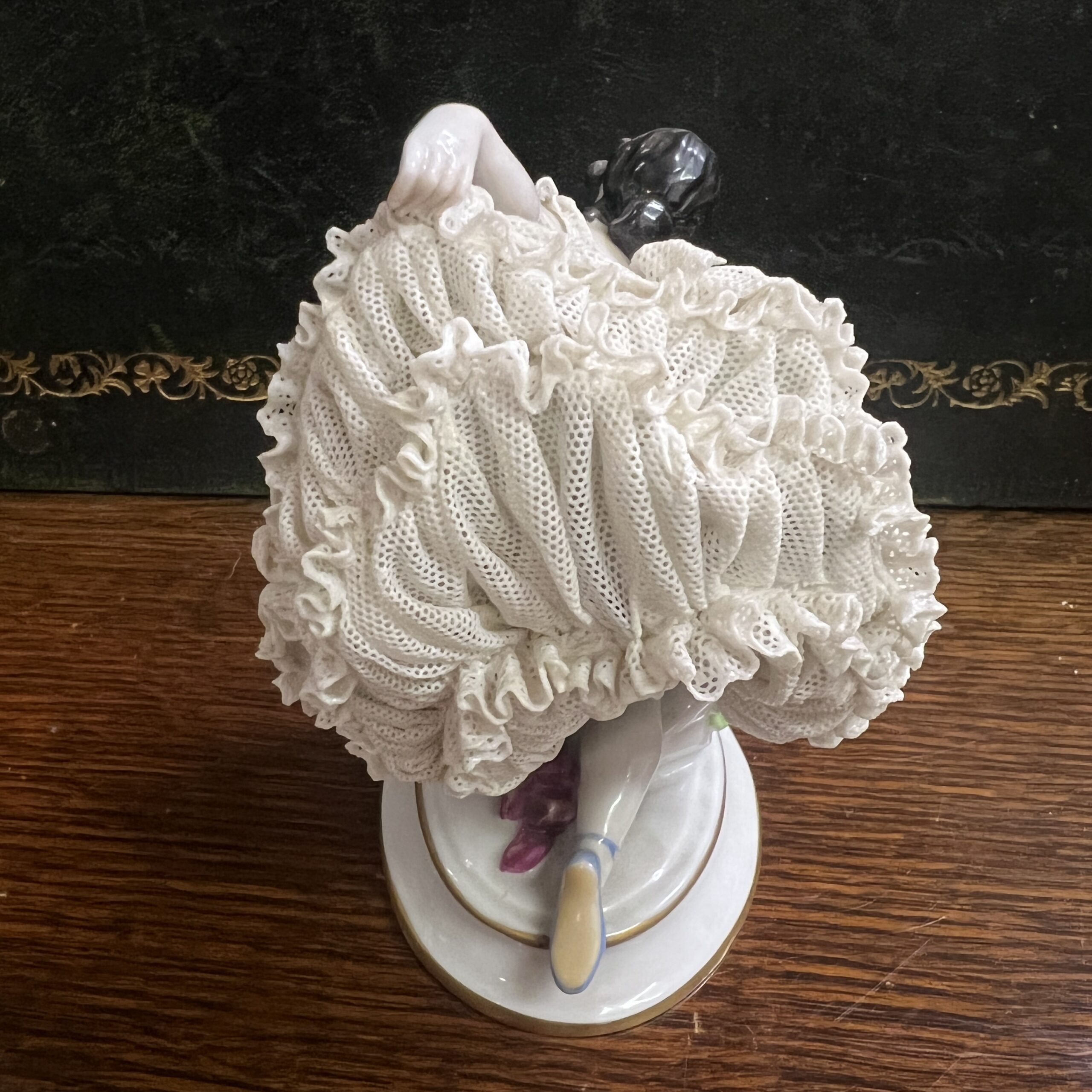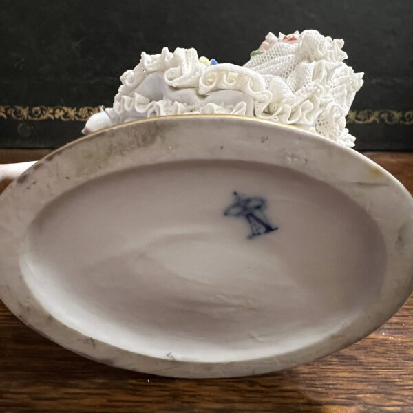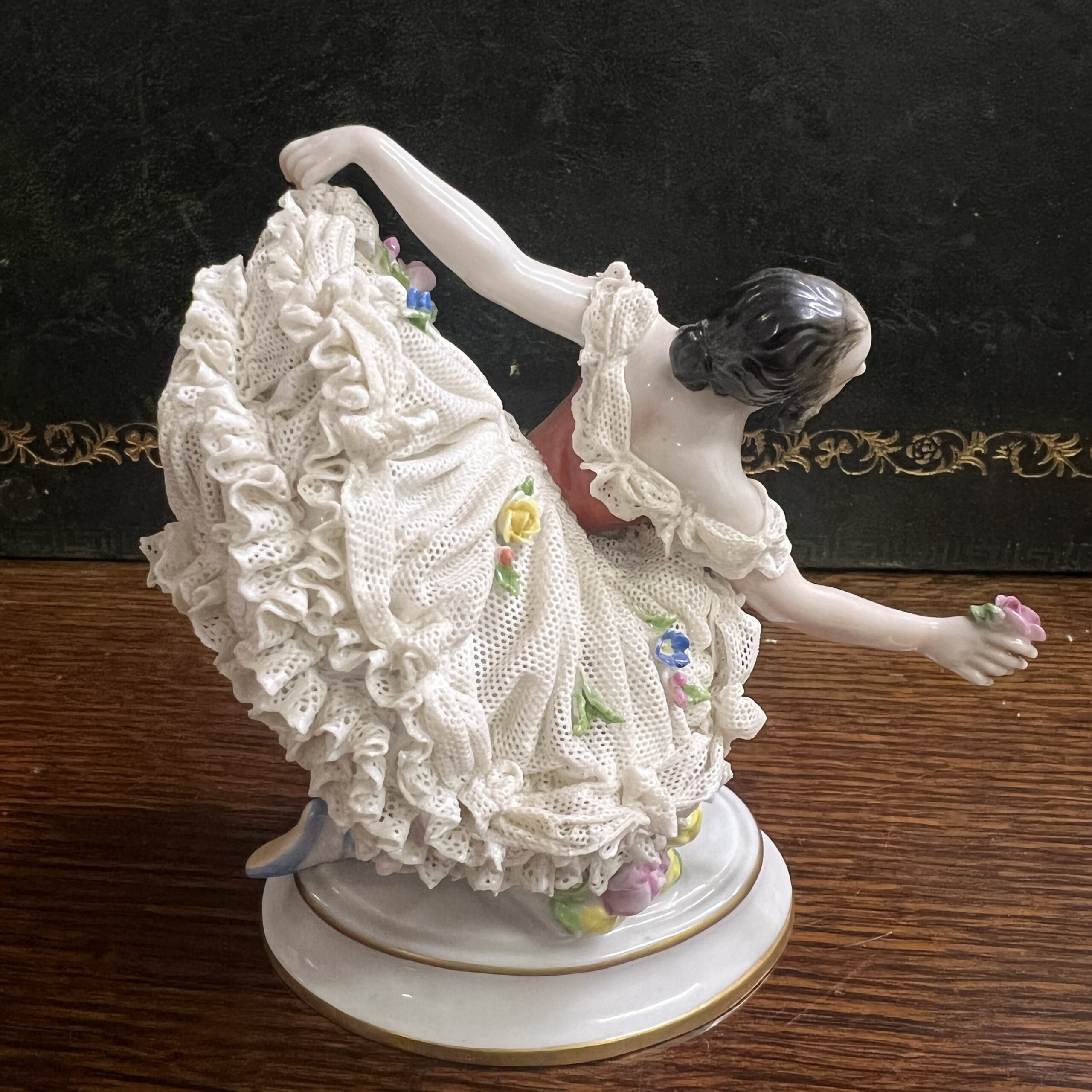 An early 20th century Dresden porcelain lacework curtseying ballerina adorned with flowers