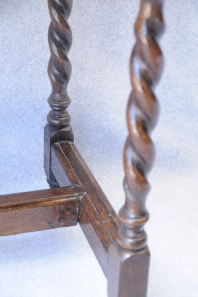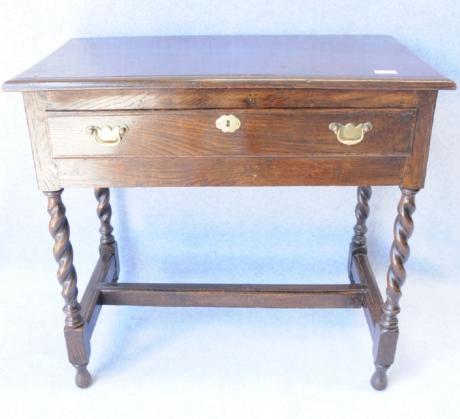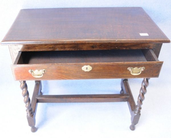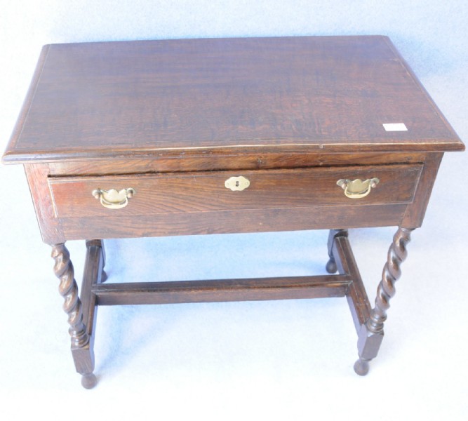 An early 19th century English oak side table with single drawer with brass handles and escutcheon, the Jacobean twist legs have a stretcher rail.