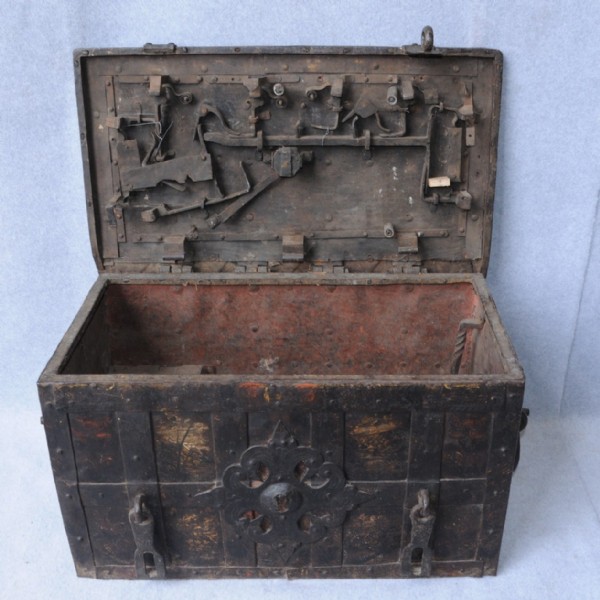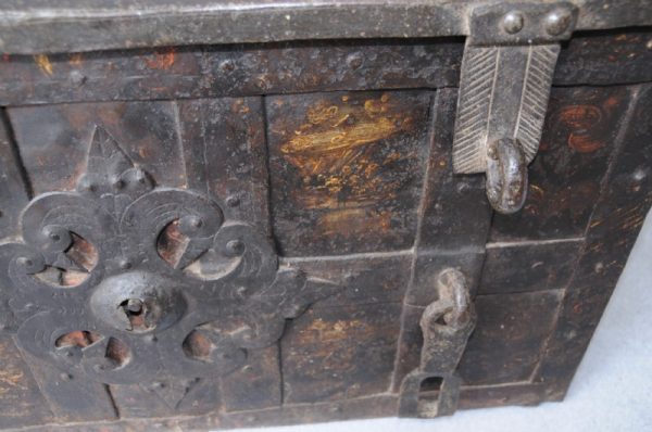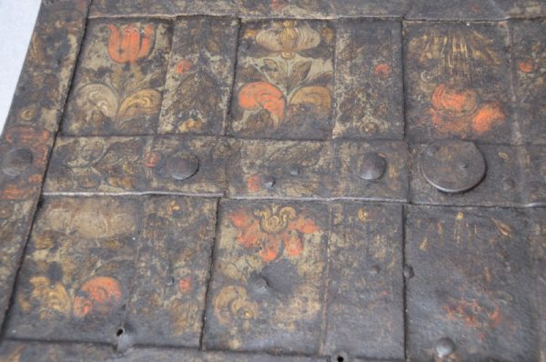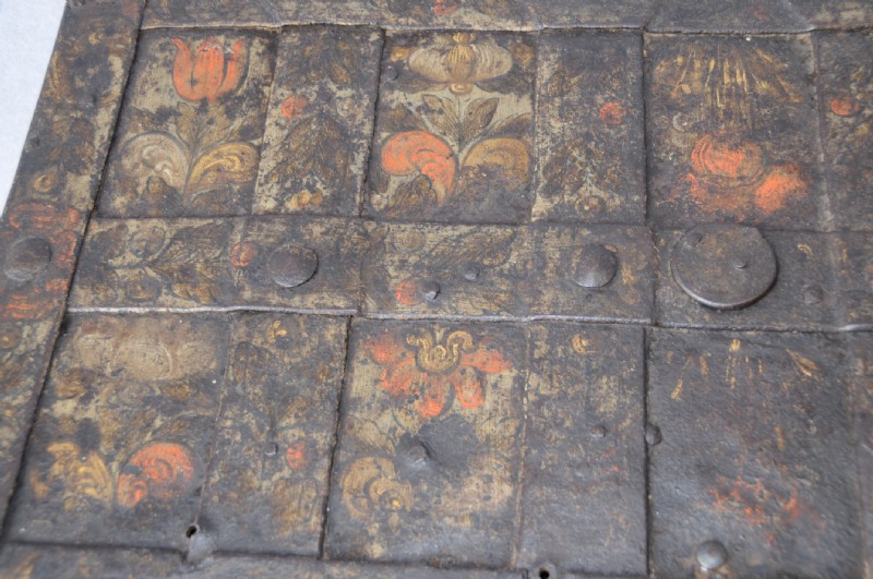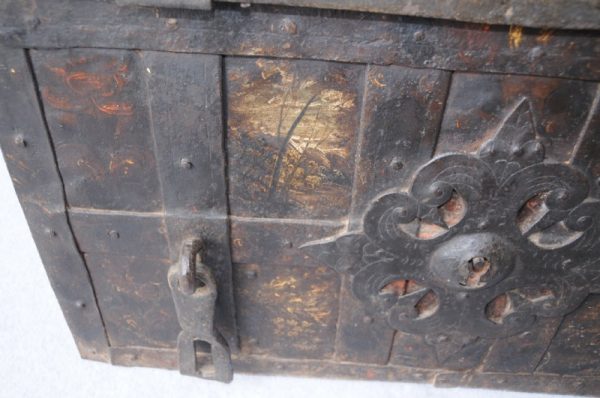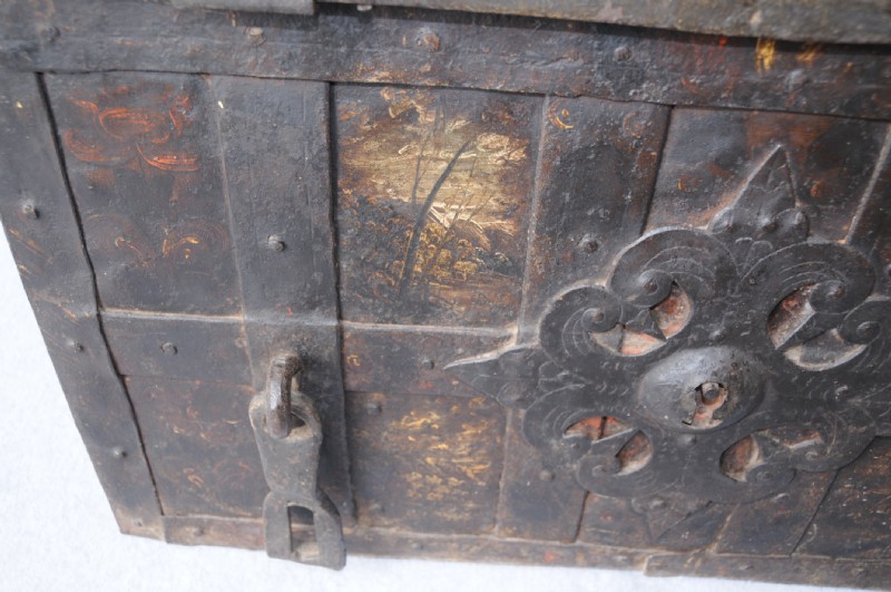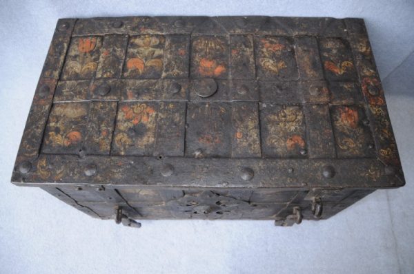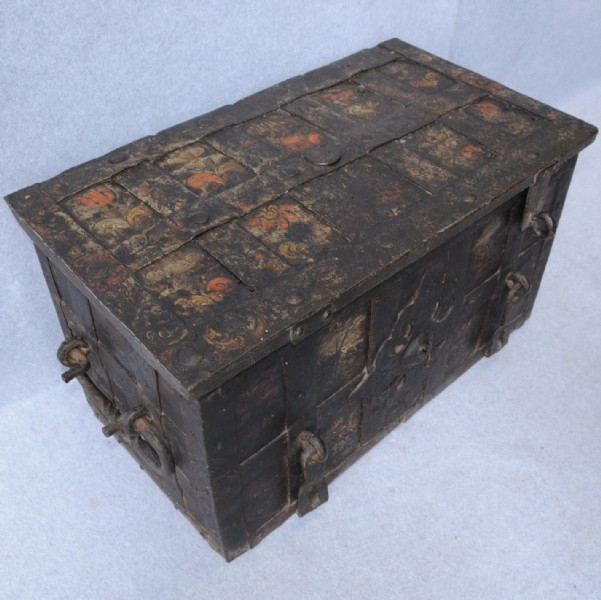 A 17th/18th century continental wrought iron strong box, the strap work rectangular rising top above similarly worked sides, flanked with carrying handles. The panels are painted with different floral as well as landscape scenes. The well engineered locking system locks in eight places.