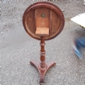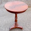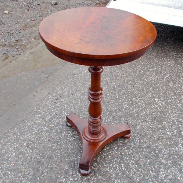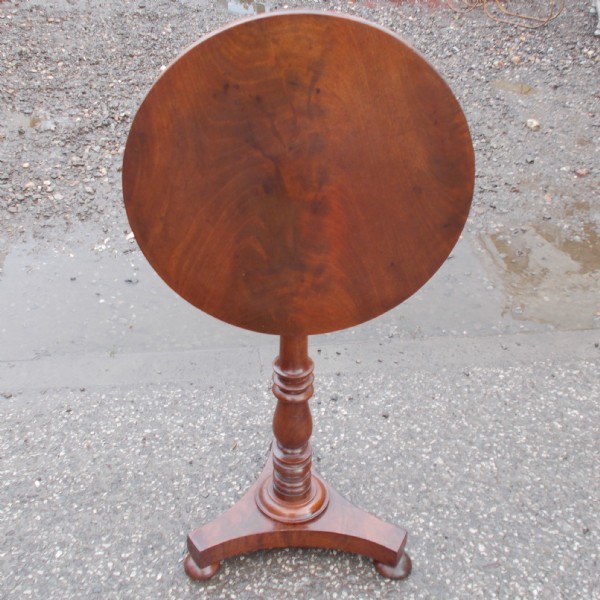 An Early Victorian flame mahogany tilt top wine table with a turned pedestal support and tripod base that sit on bun feet