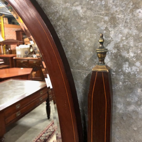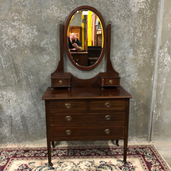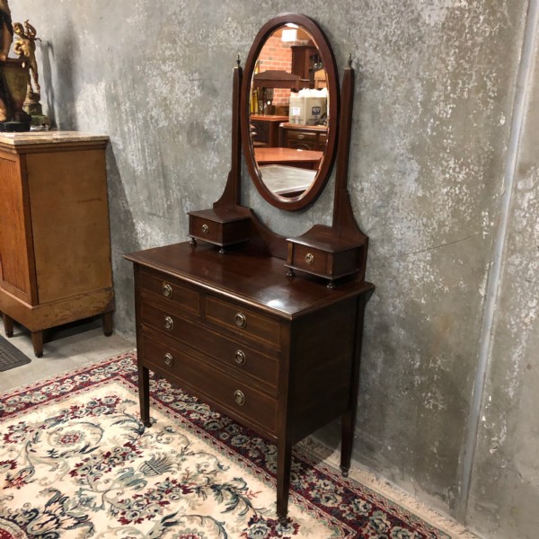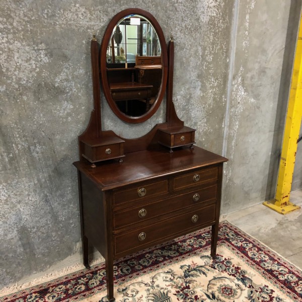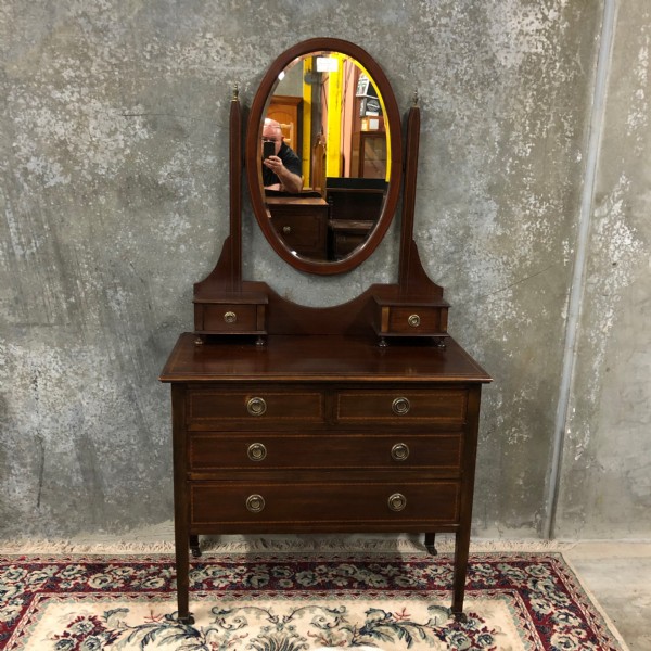 An Edwardian mahogany inlaid dressing chest raised on square tapering legs. It has two half width drawers over two full width, drawers each with brass ring handles. The swing mirrors supports terminate with brass finials the base a pair of small drawers