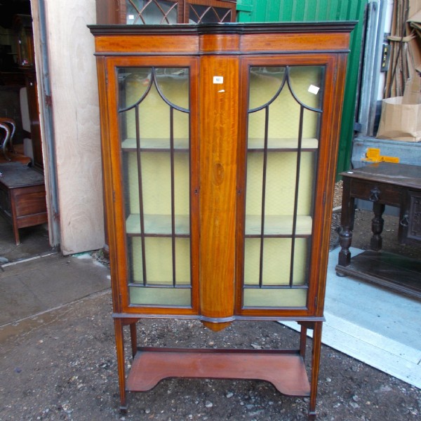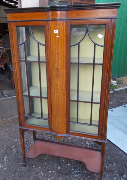 An Edwardian mahogany inlaid display cabinet the two astragal glazed doors enclose shelves. The centre has a semi circular panel the square tapering legs terminate on spade feet. There is a shaped lower open shelf.