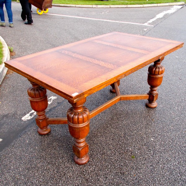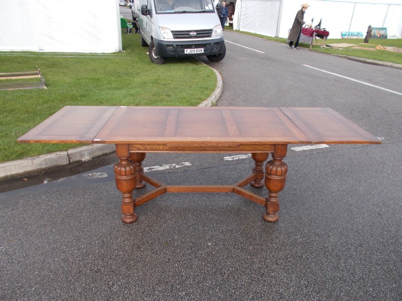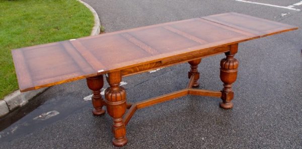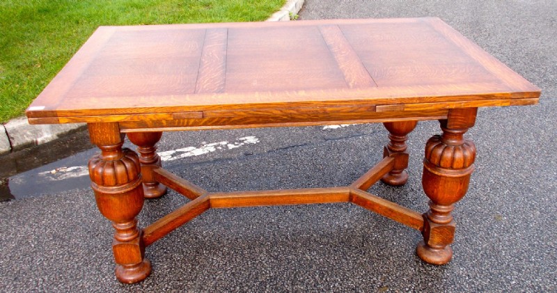 Large Edwardian oak extendable drawer leaf table with bulbous turned legs with stretcher