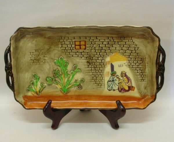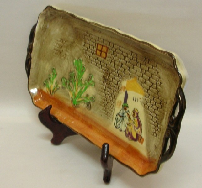 Egyptian scene hand painted sandwich plate with pierced handles.