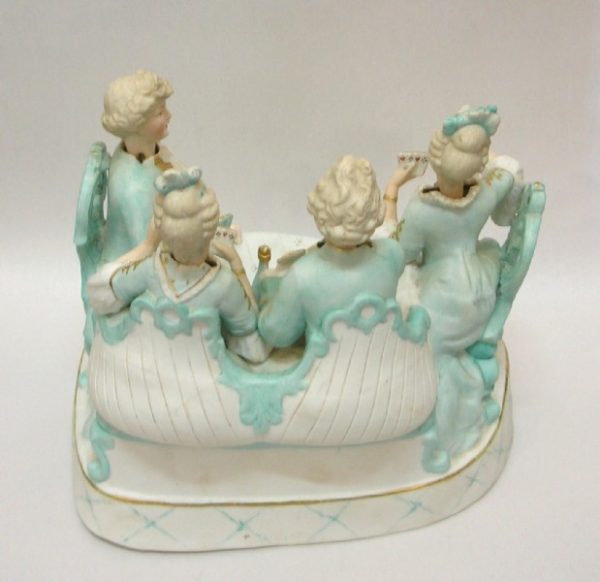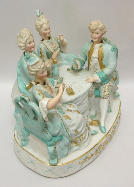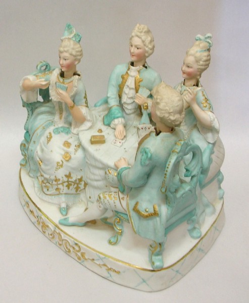 French bisque hand crafted and painted nodding head group figurine playing a game of cards, with superb detail to their faces, outfits and furniture, decorated with 22ct gold gilt.