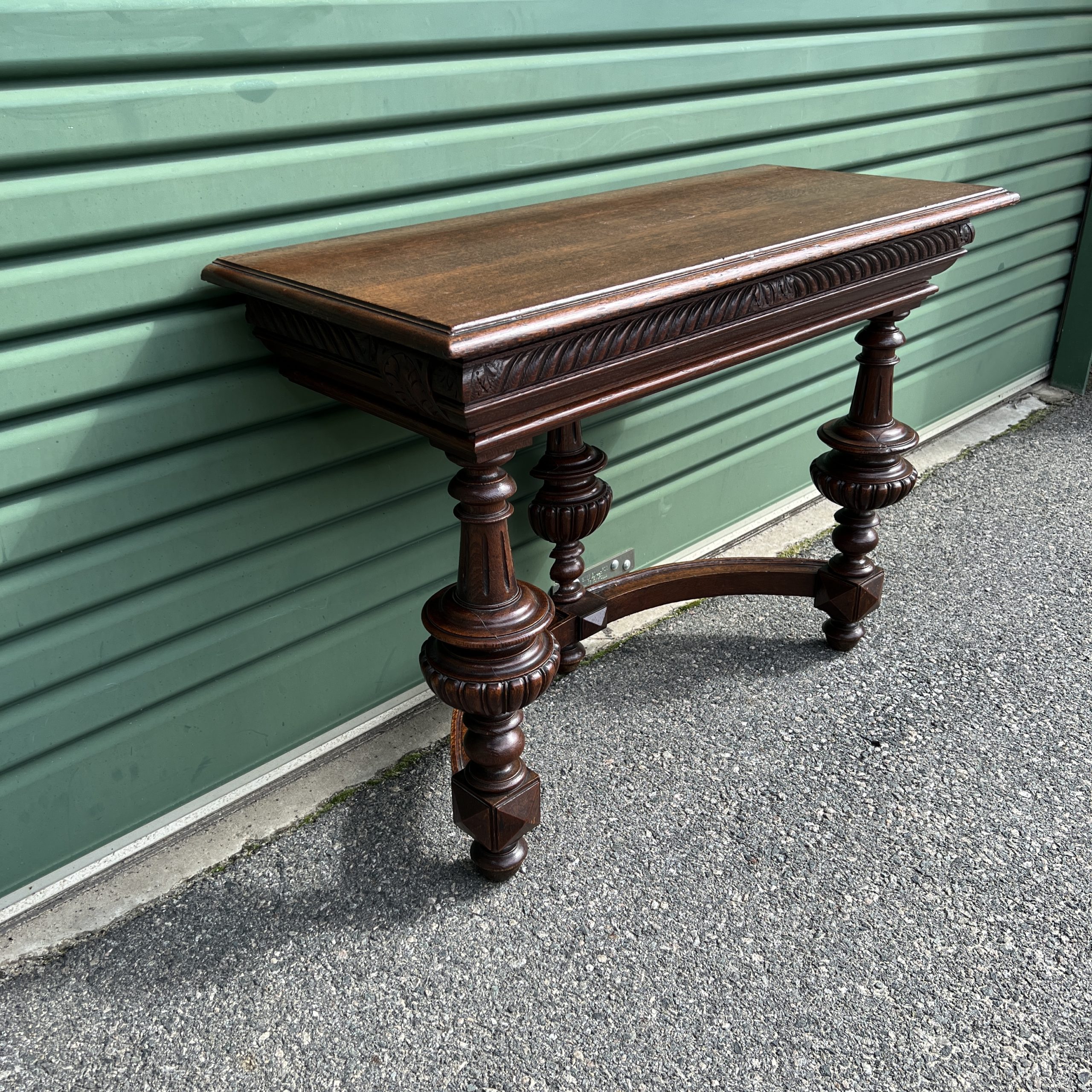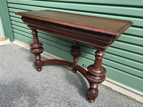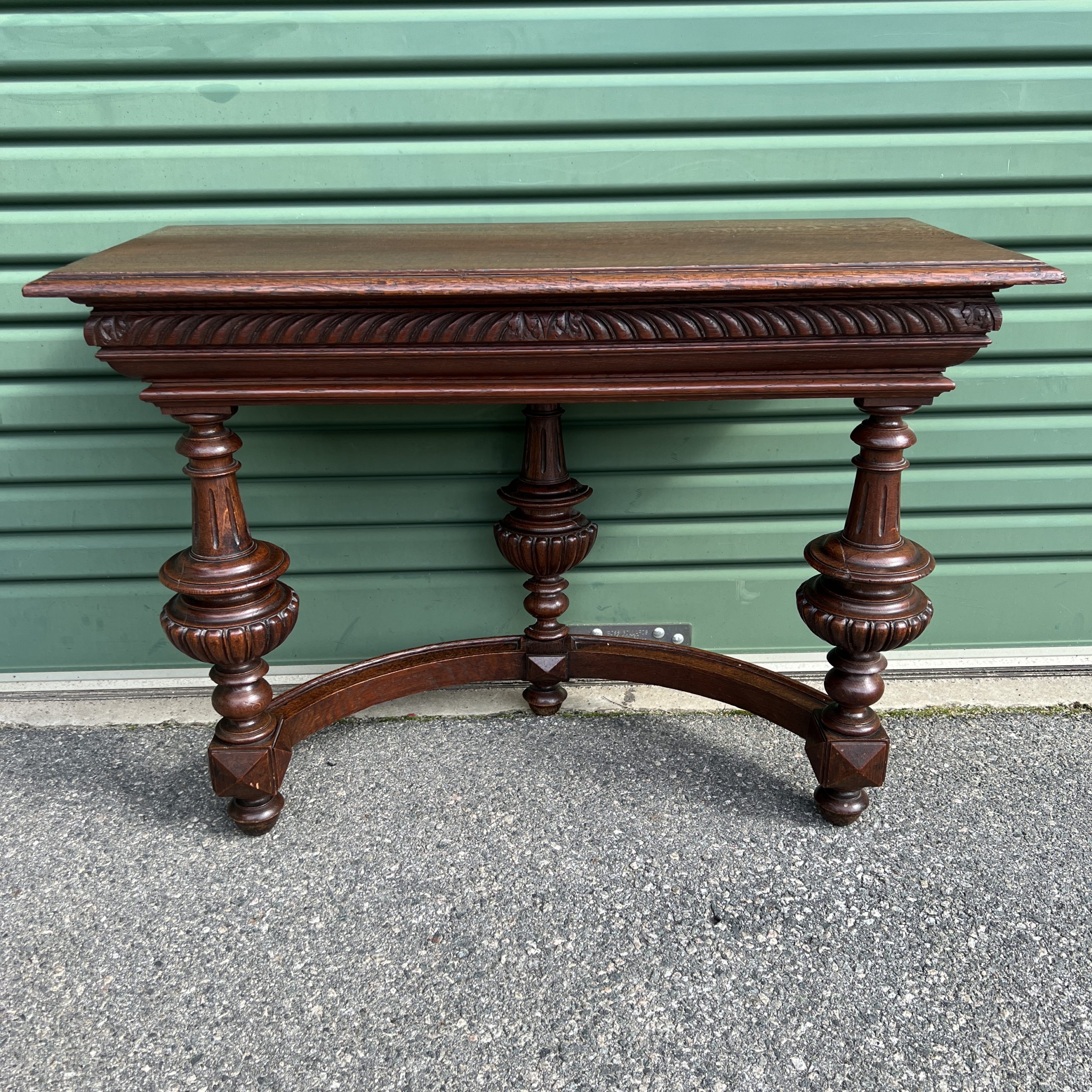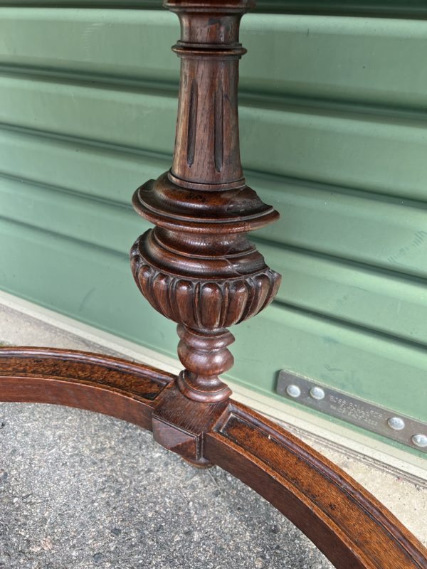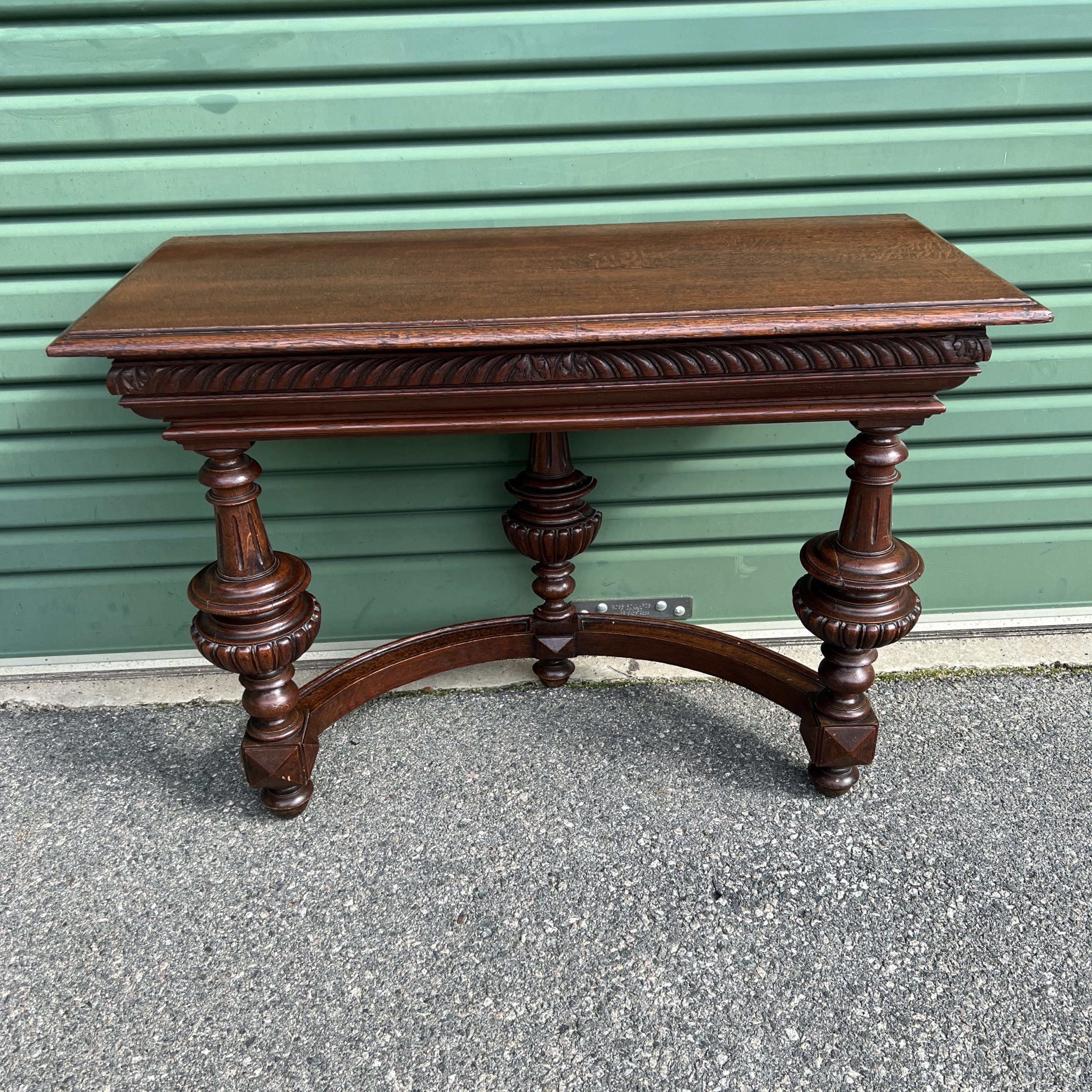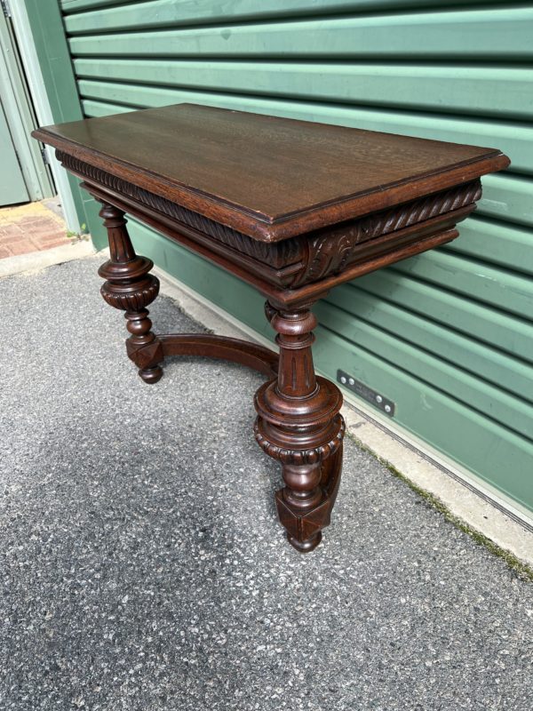 A 19th century french side table with gadroon carving to the freeze rail and bulbous turned legs, it has a semicircular stretcher rail and is raised on turned feet.