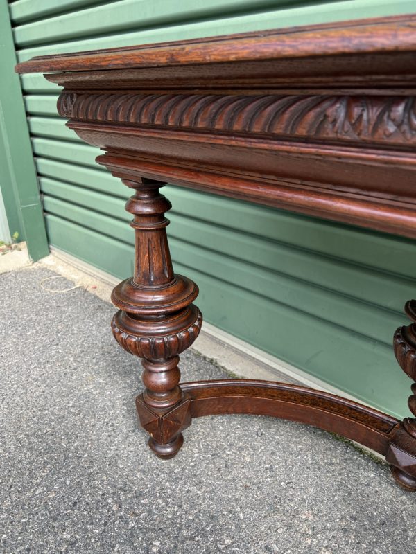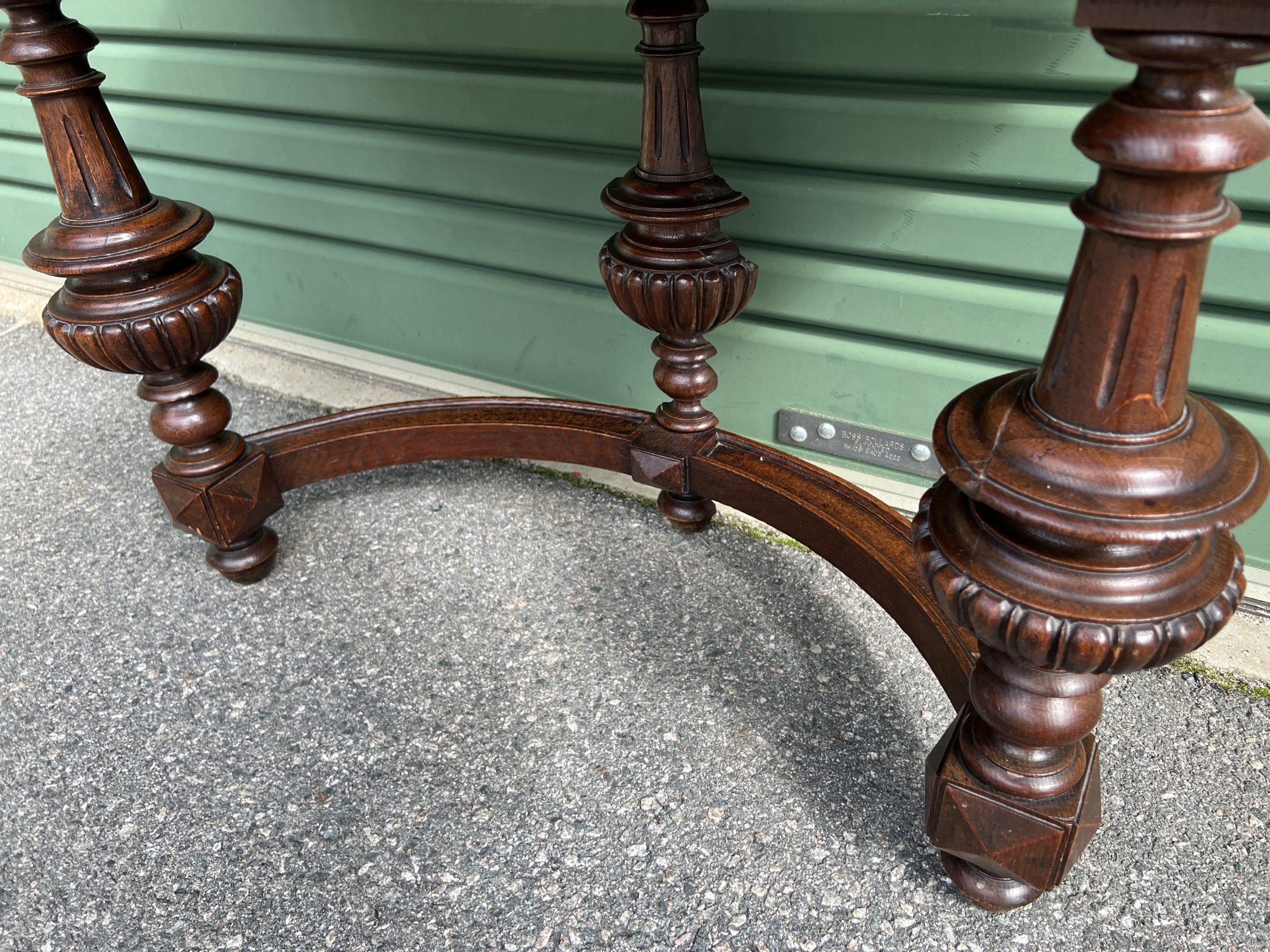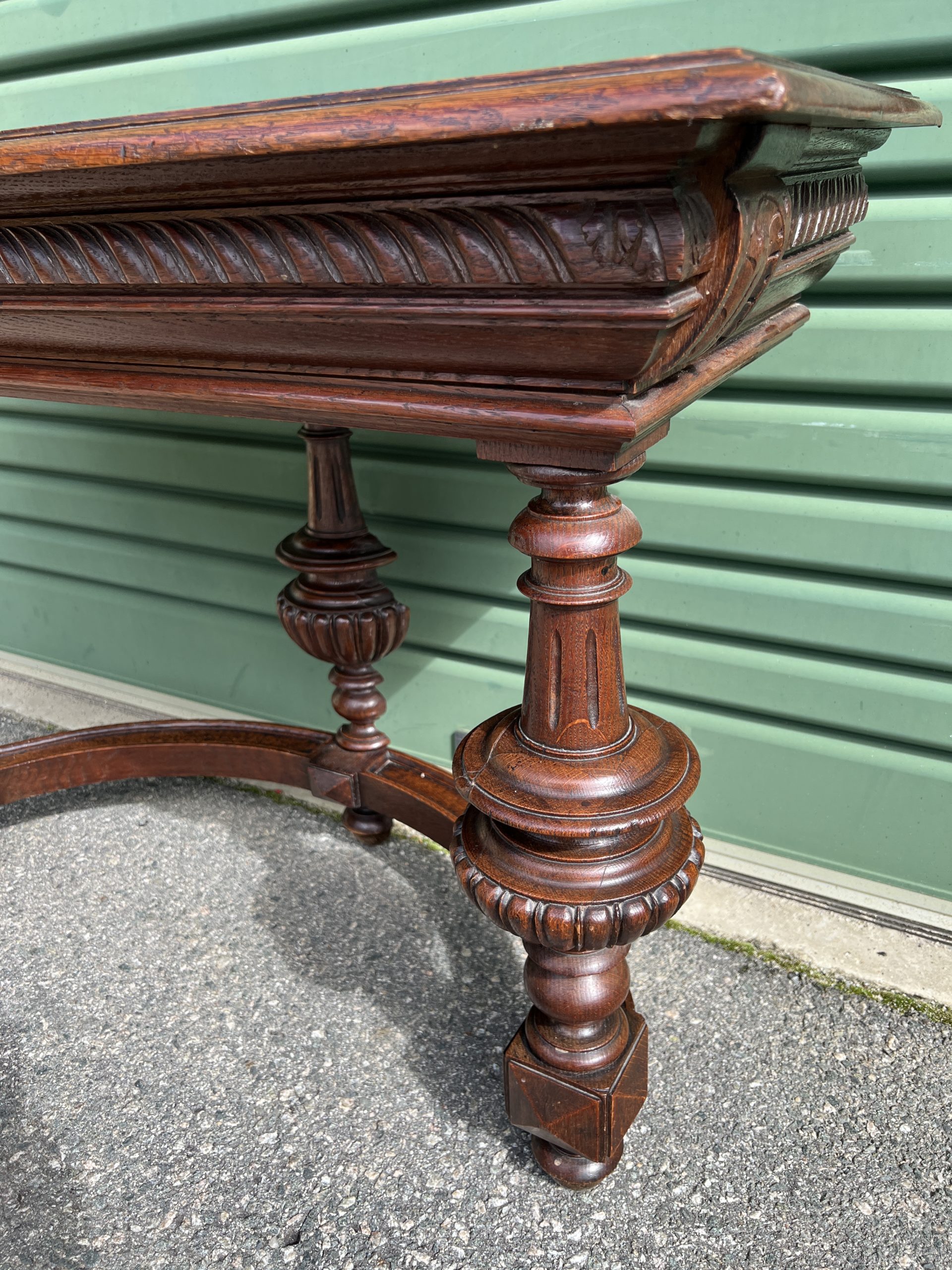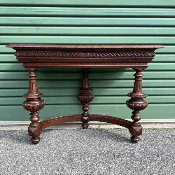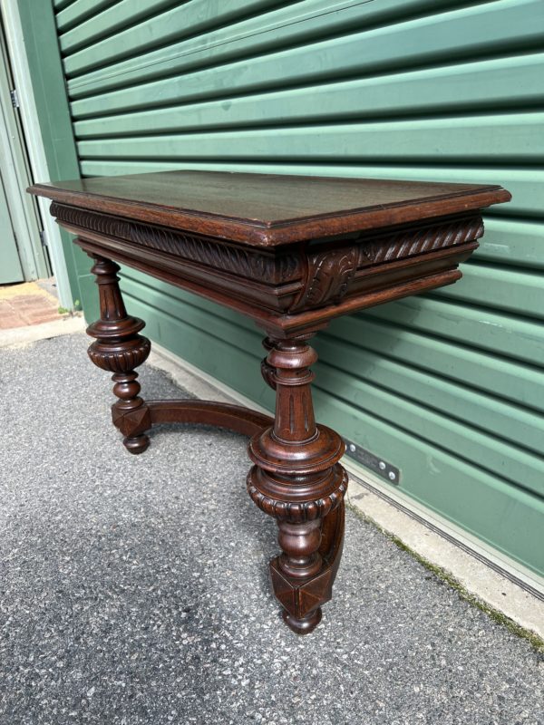 A 19th century french side table with gadroon carving to the freeze rail and bulbous turned legs, it has a semicircular stretcher rail and is raised on turned feet.