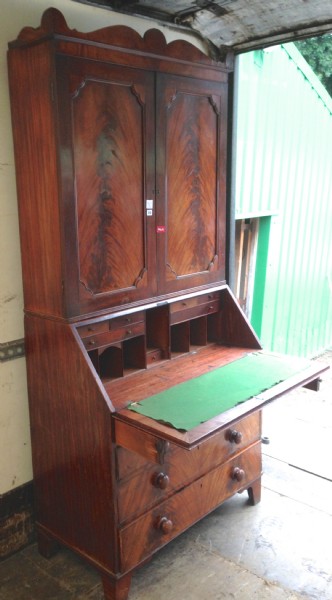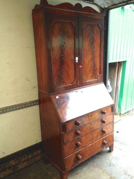 Georgian Flame mahogany bureau bookcase the shaped pediment over two panel doors that enclose adjustable shelving. The fall opens to reveal an arrangement of pigeonholes, drawers a door and secret compartment. There are four graduating drawers all constructed with hand cut dovetail joints all raised on bracket feet.