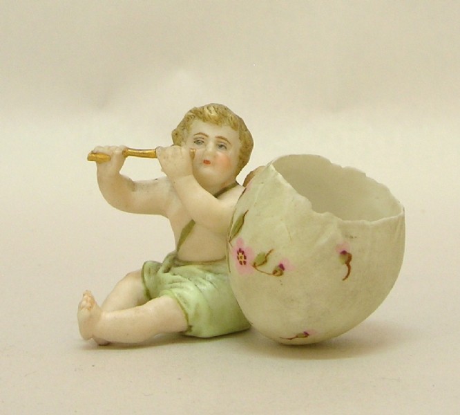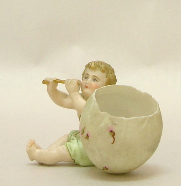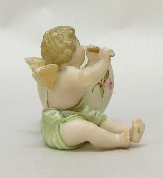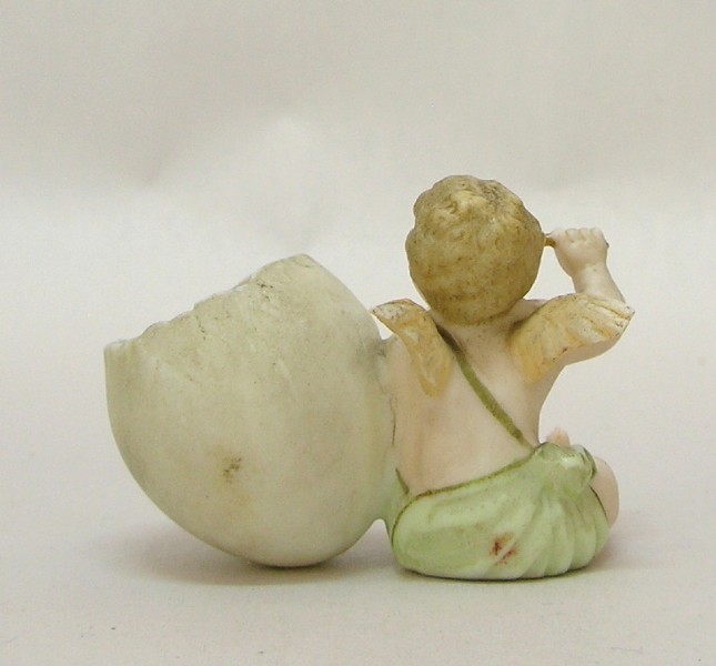 German Bisque miniature hand painted cupid with egg shell, A.F.