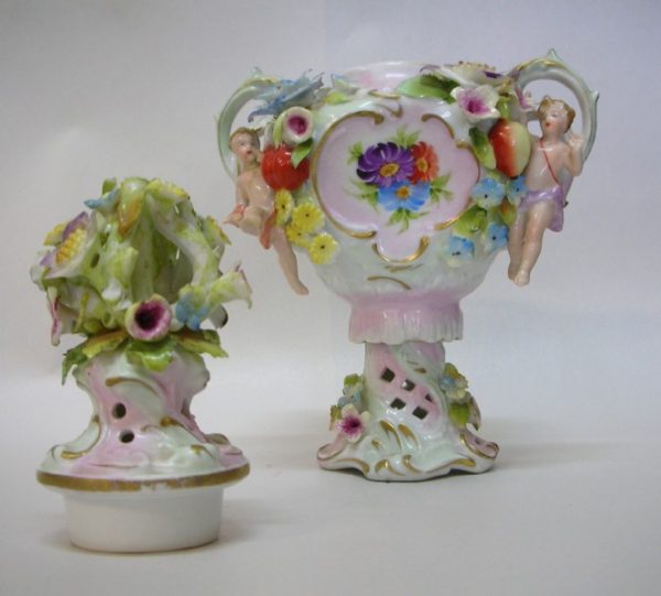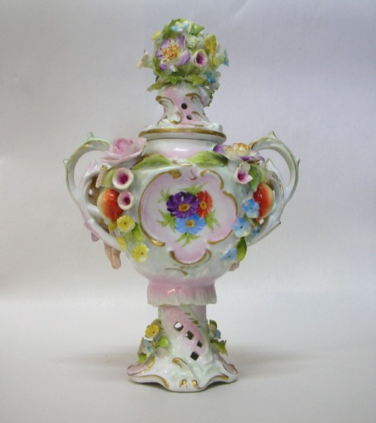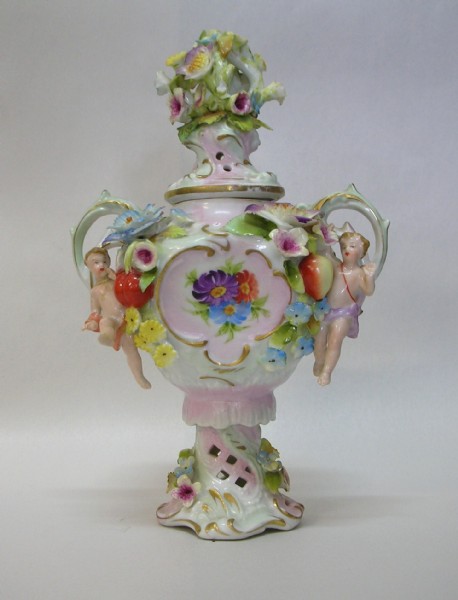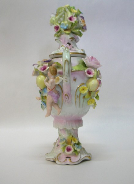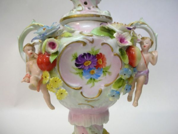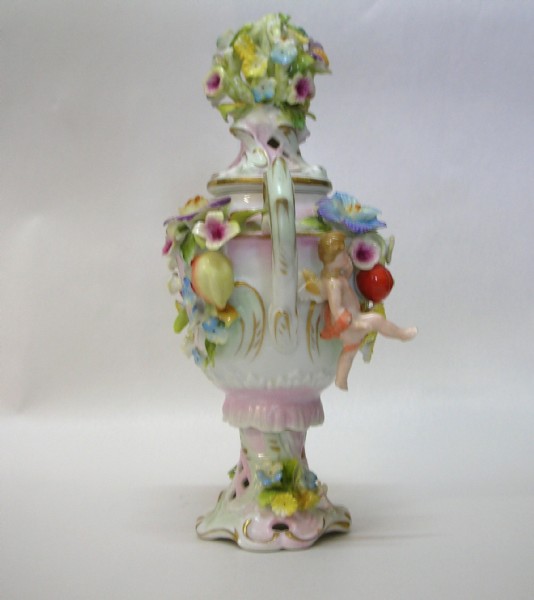 German Porcelain Hand Painted & Crafted Two Handle Lidded Urn, Encrusted With Flowers, Fruit & Cherubs, With Pierced Decoration.