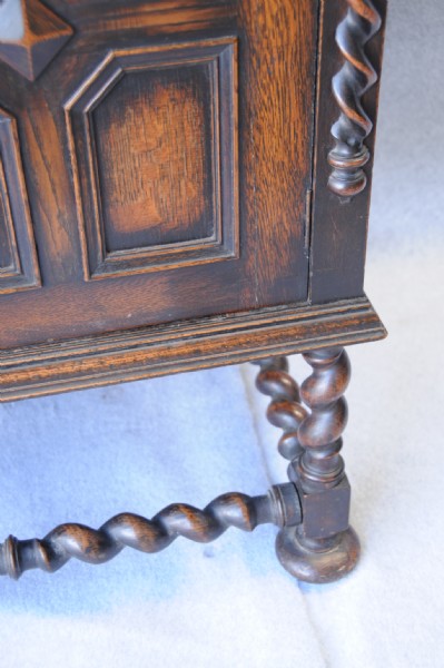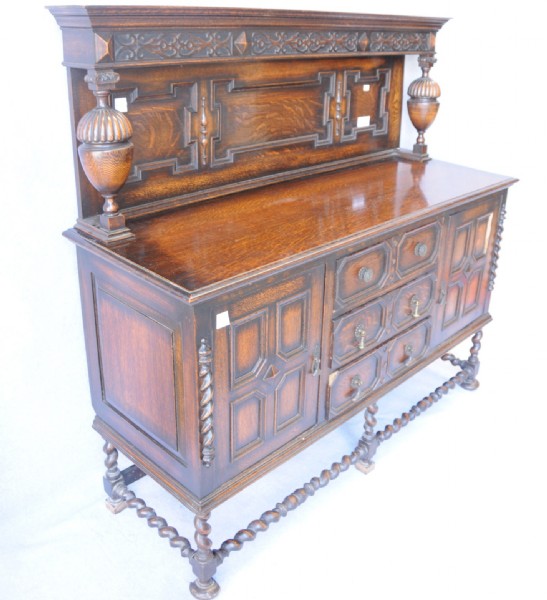 An English oak Jacobean style sideboard, the top section has bulbous turned and carved columns, a heavy moulded cornice with blind fret carved into the freeze. The lower section has three central drawers flanked by two doors over barley twist legs and stretchers.