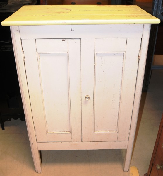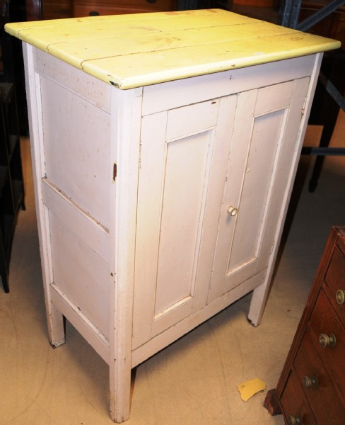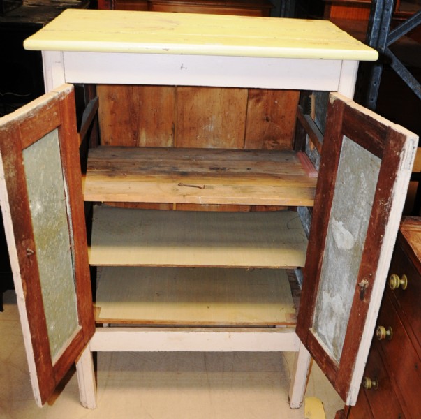 A painted Jarrah meat safe made during the great depression some construction utilising recycled packing cases.