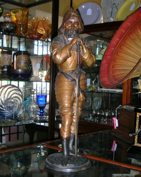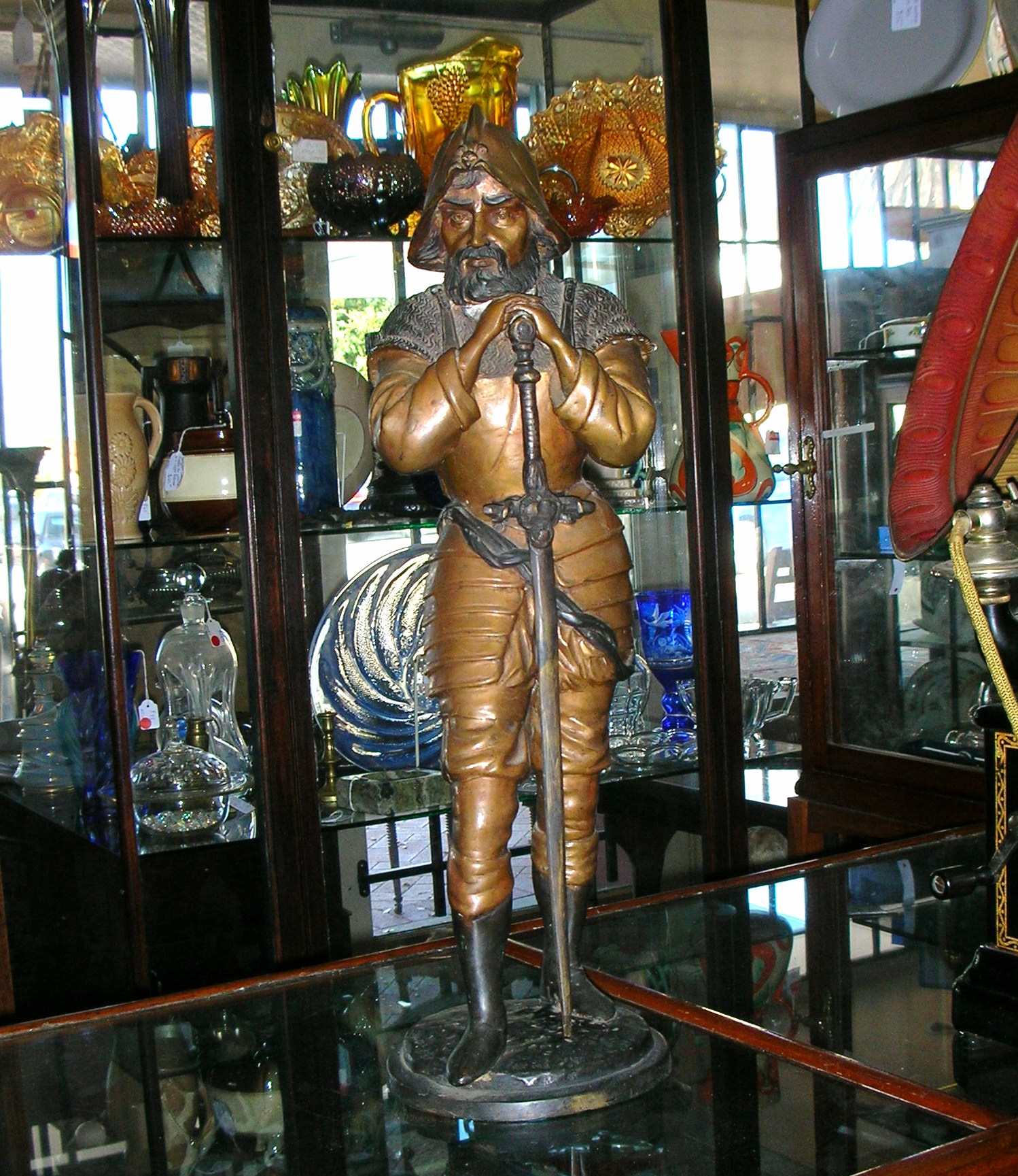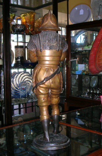 Late 19th Century knight in full armour with sword. The Spelter figure is hand coloured to a bronze finish.