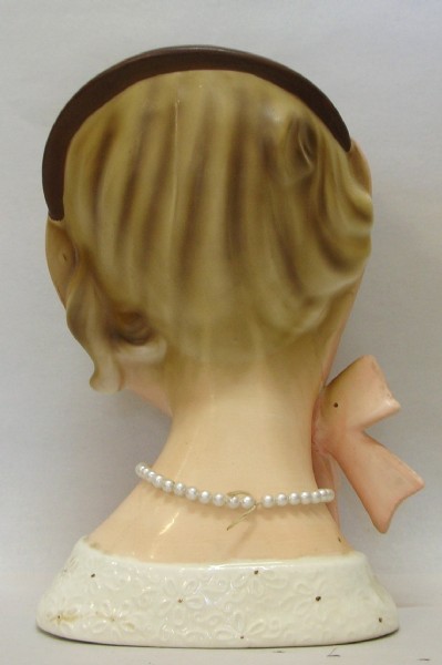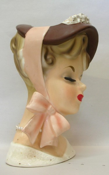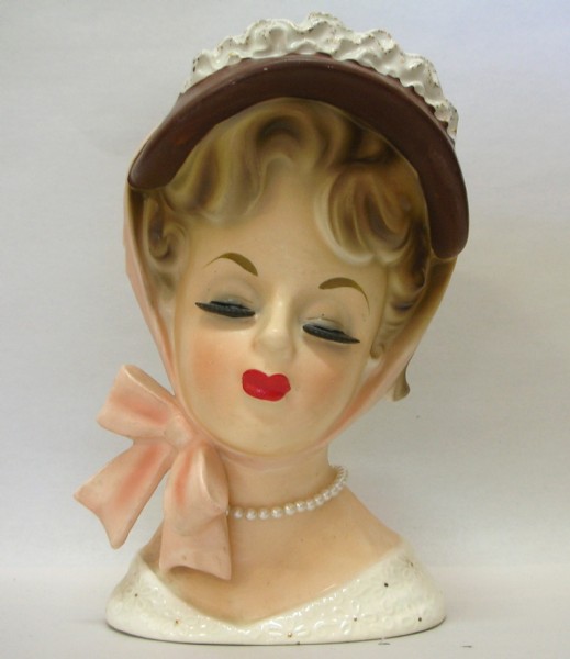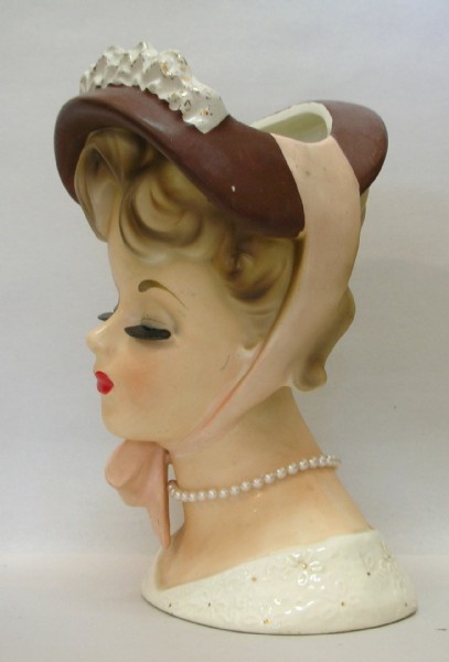 Lady’s head hand painted hat pin holder with faux pearl necklace.