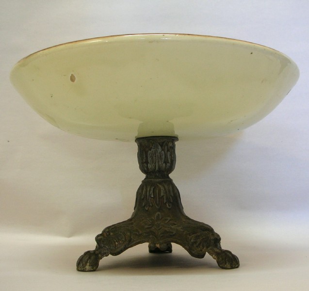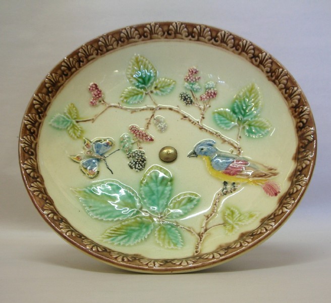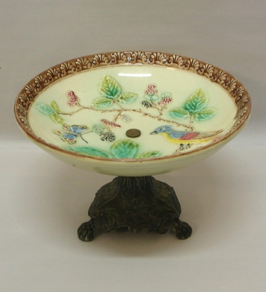 Late 19th century Majolica hand painted comport with metal base, decorated with a parrot, butterfly and black berries.