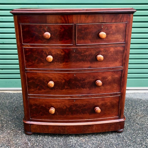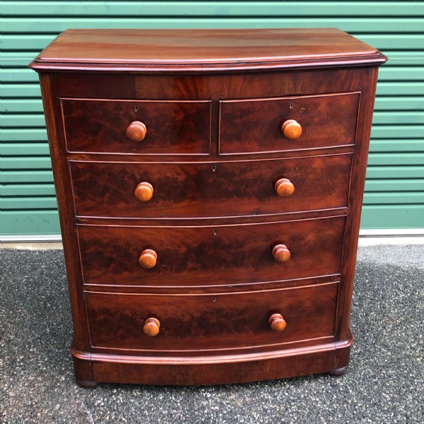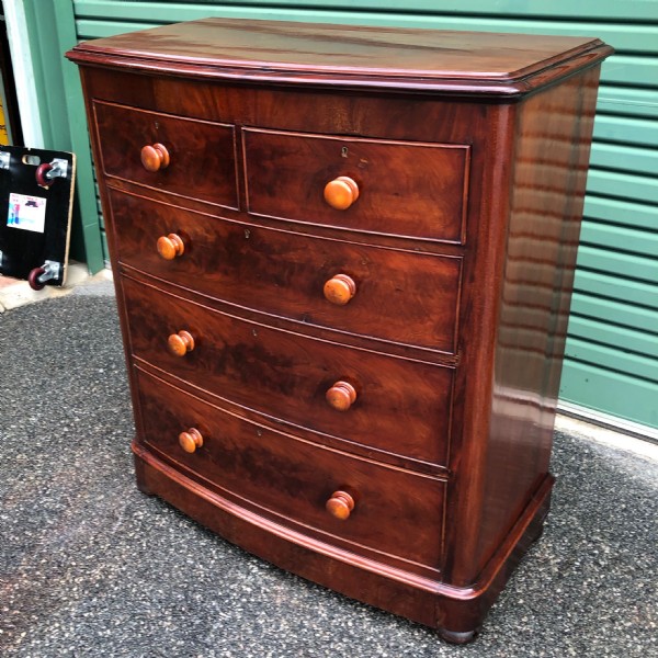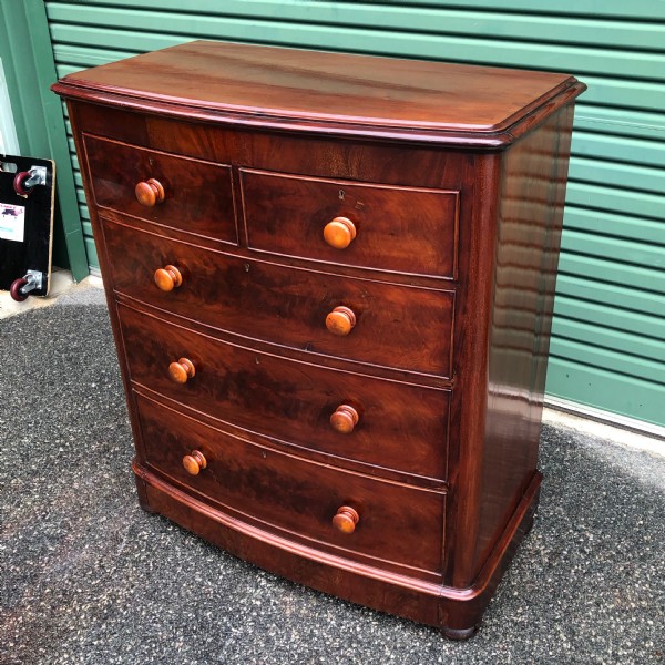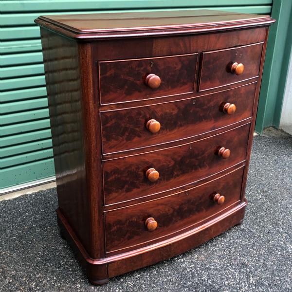 A late Victorian flame mahogany bow front chest of five drawers, each drawer has a cock beaded edge and has a turned mushroom knob, standing on a plinth base and bun feet c1880. As the chest of drawers is a bow front measures 500mm deep on each side and 570mm in the middle