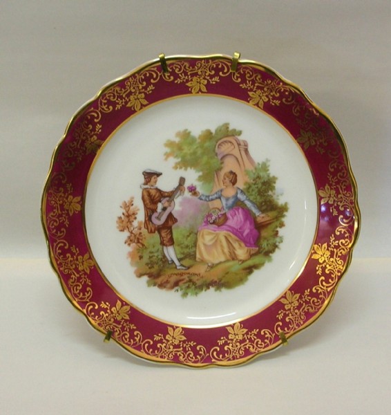 Limoges Burgundy “Fragonard” cabinet plate with plate stand.
