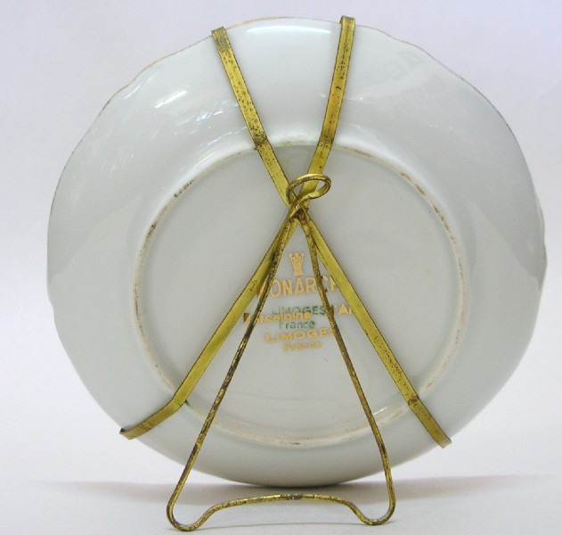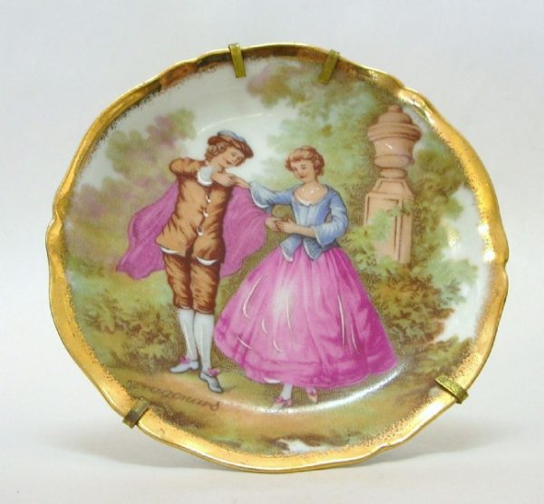 Limoges Porcelain Miniature Dish & Stand, With The “Fragonard” Scene & Gilt Decoration. Marked Monarch, Porcelaine d’ Art.