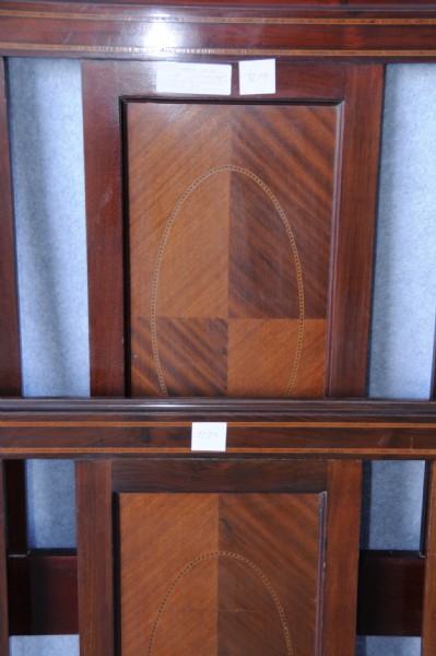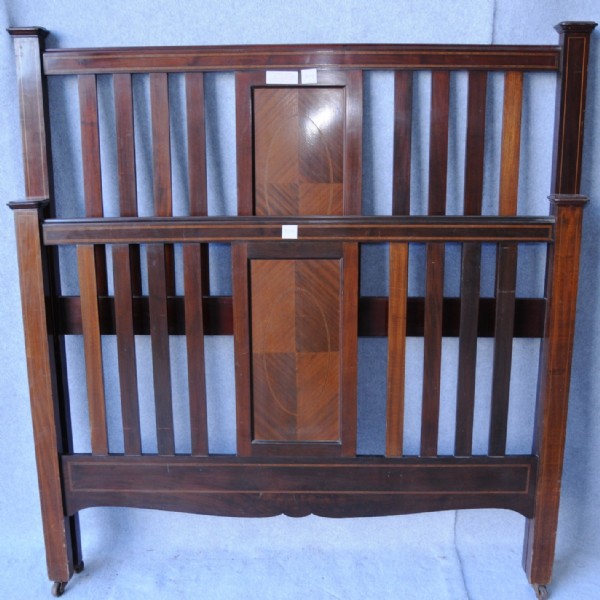 A Edwardian mahogany slatted double bed with boxwood stringing inlay, the centre has a rectangular quartered panel with oval inlay. The bed end has a decorative shaped apron, the bed is raised on casters.