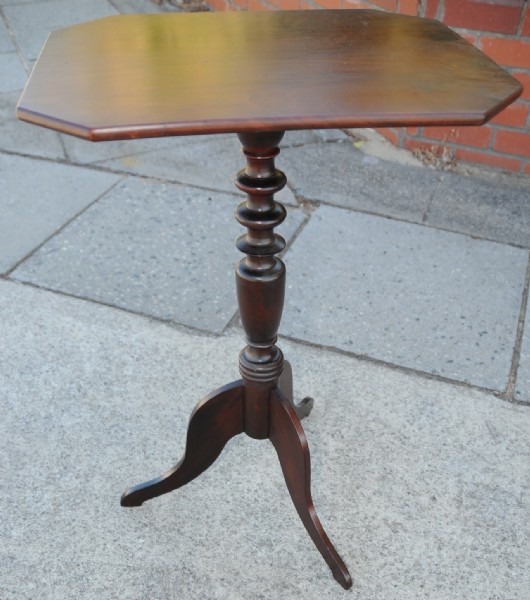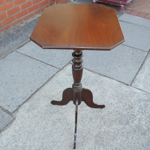 A mid Victorian mahogany tilt top wine table the rectangular top has angled corners and is raised on a turned pedestal and tripod base.