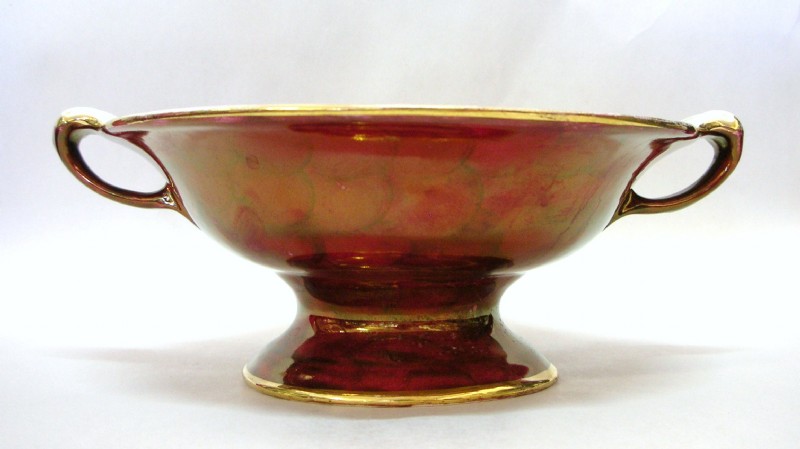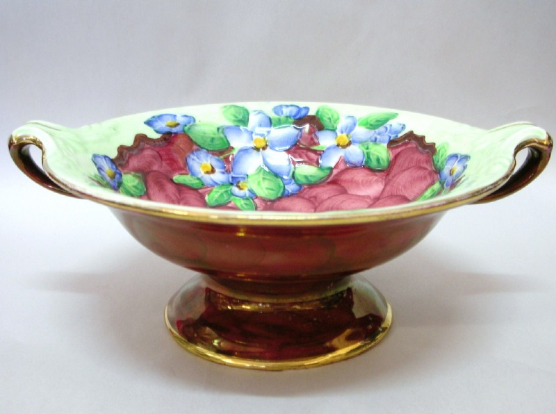 Maling Ware Hand Painted Burgundy Lustre Two Handle Dish In The “Blossom Blough” & Thumb Print Pattern, With Gilt Edging.