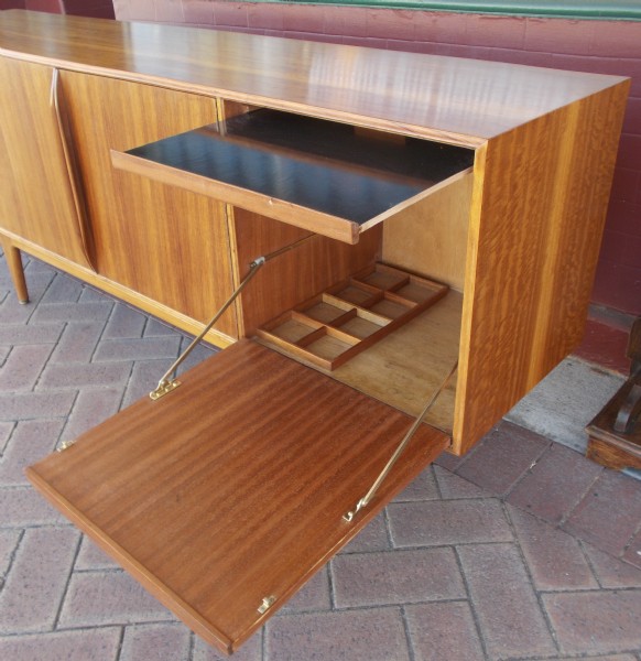 A mid-century teak sideboard with a bank of three drawers two central doors and a lift down bar serving platform with slide out drinks tray. Produced by Scottish furniture manufacturer McIntosh