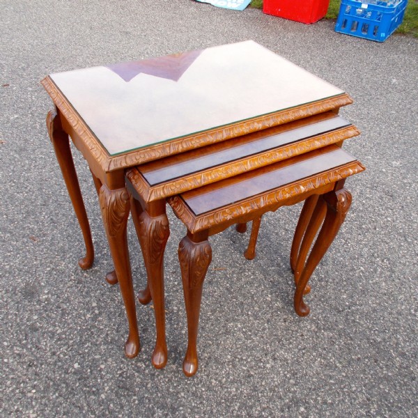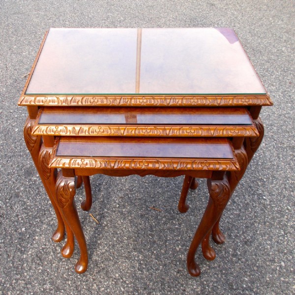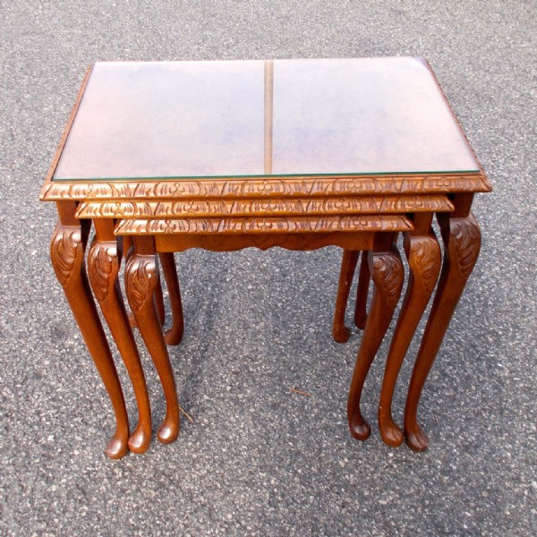 Nest of three mahogany tables each with craved edge cabriole legs and inserted glass top