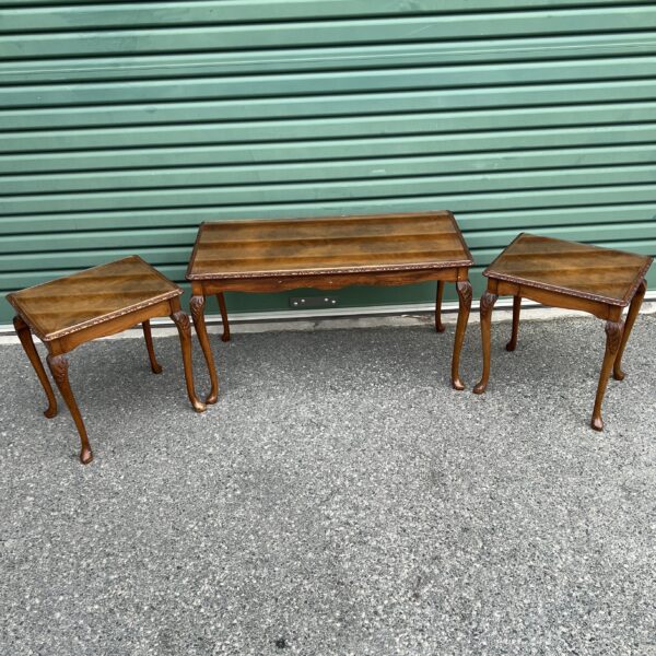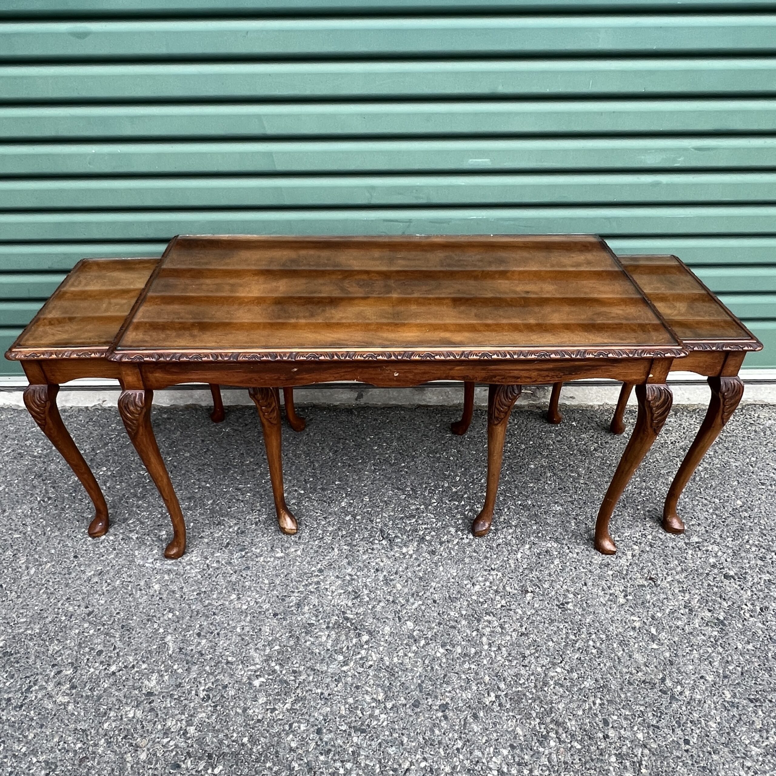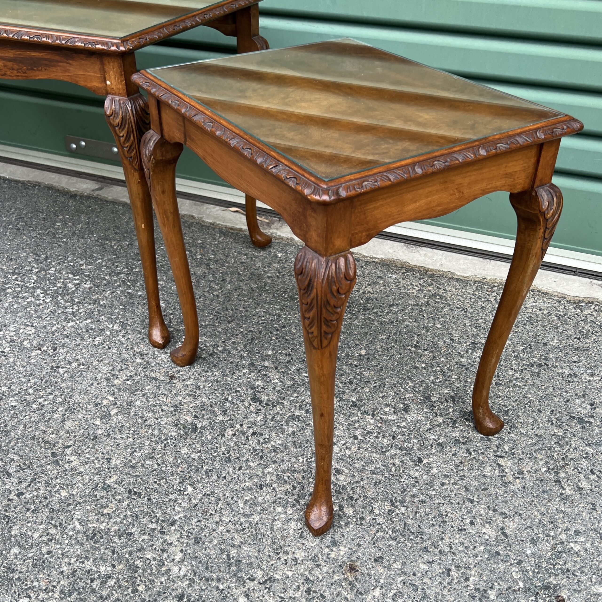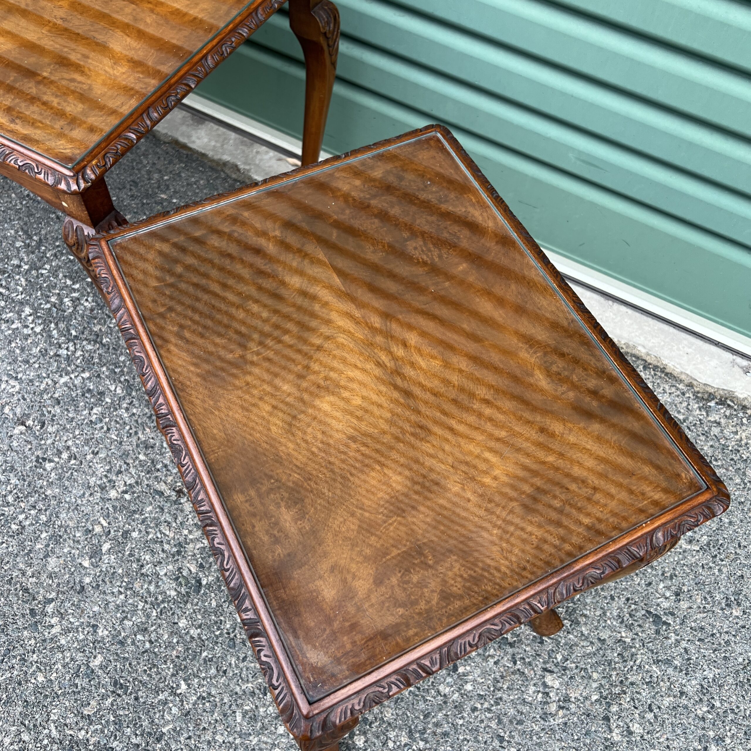 A nest of three walnut coffee tables with decorative carved edge and glass tops. The cabriole legs have carved acanthus leaf and bun feet
