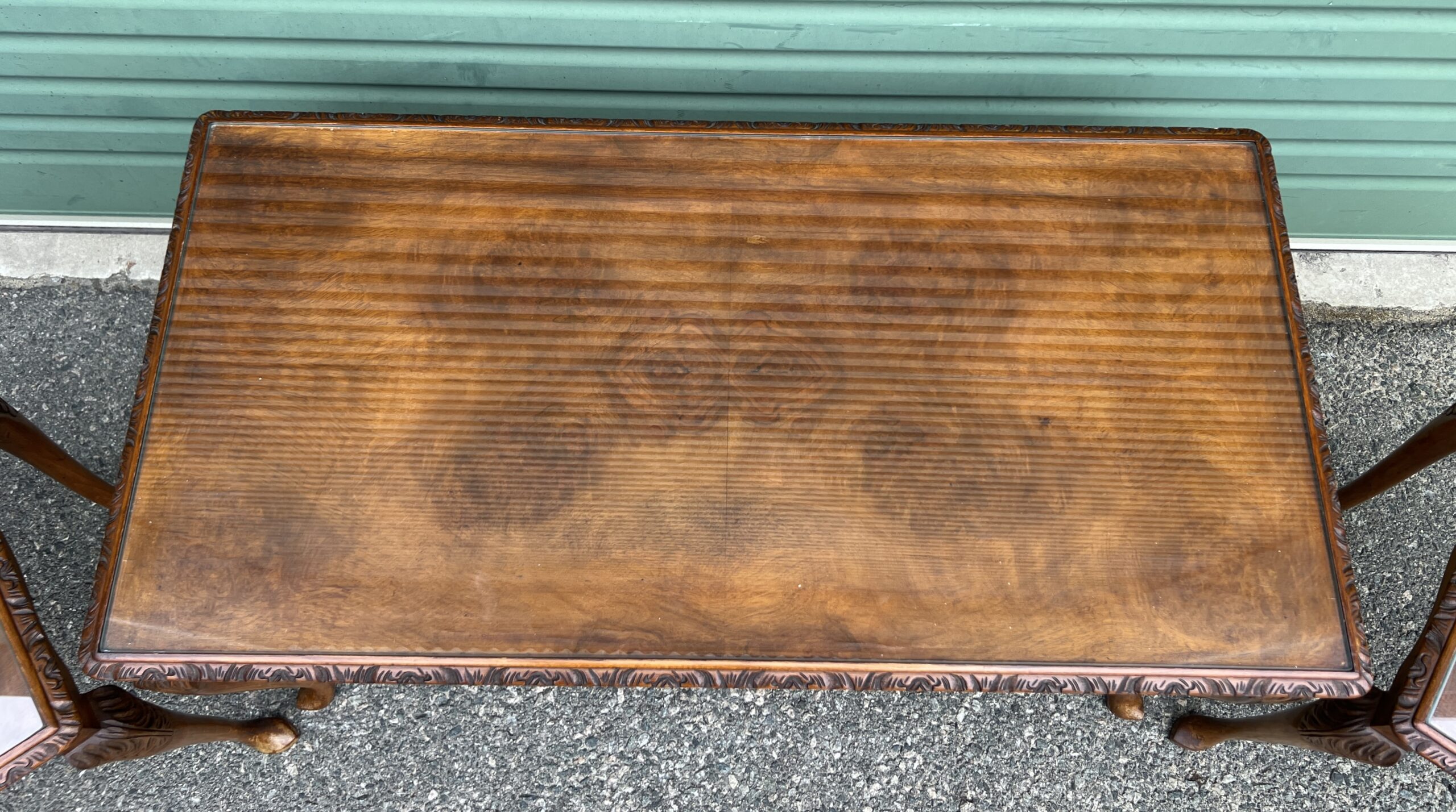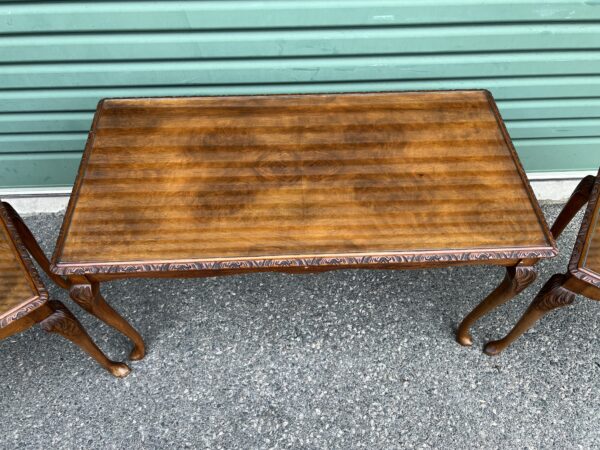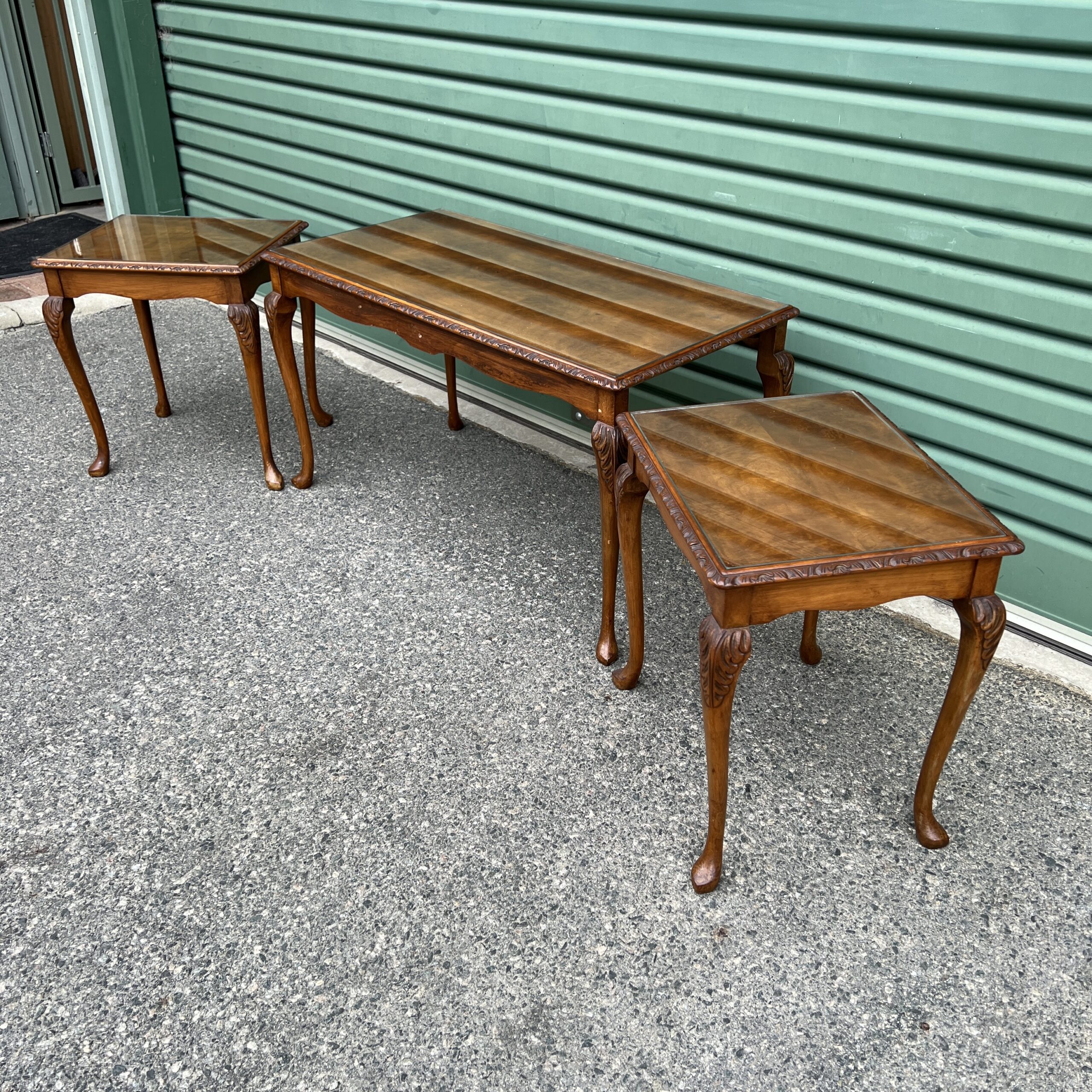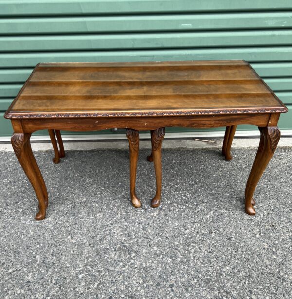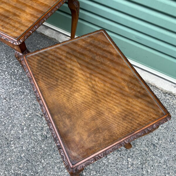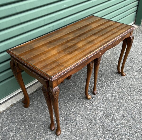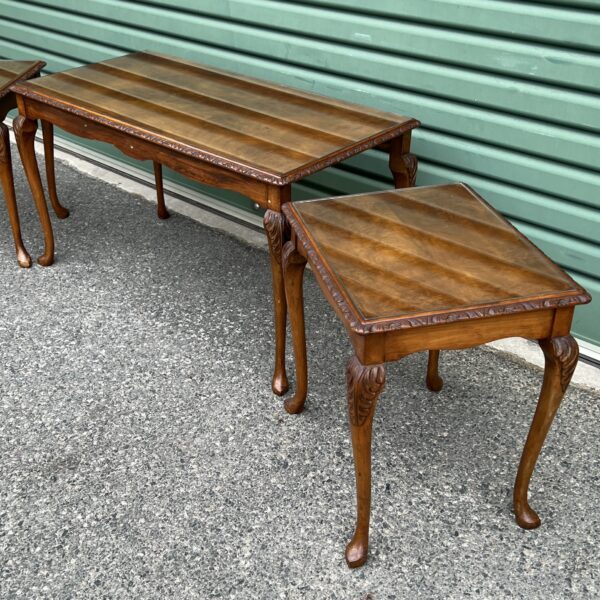 A nest of three walnut coffee tables with decorative carved edge and glass tops. The cabriole legs have carved acanthus leaf and bun feet