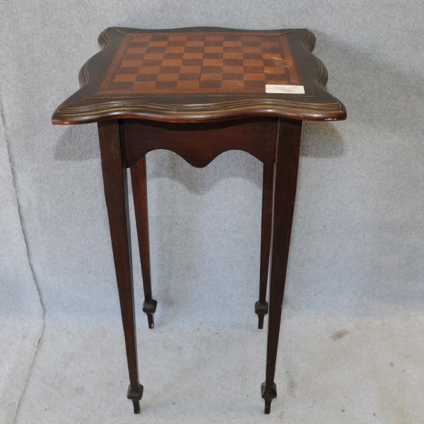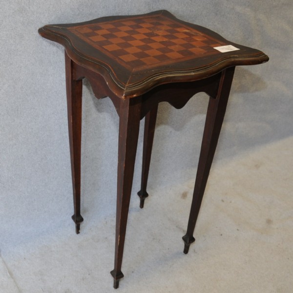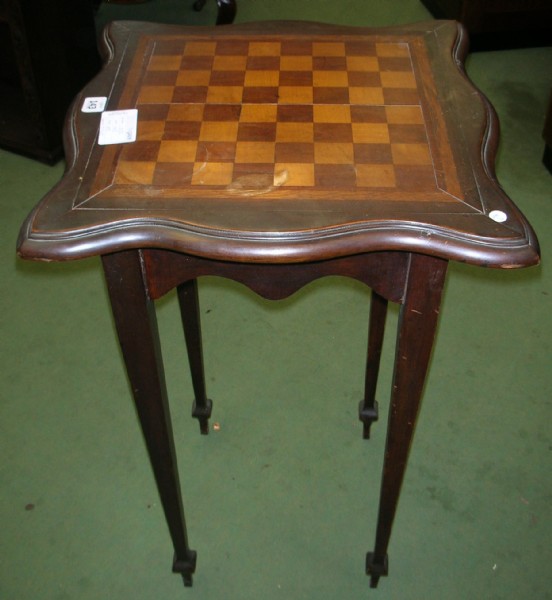 A late Victorian games table with chest board top, moulded edge tapering legs with Art Nouveau influence. Complete with draught pieces Size: 80 high x 47 wide x 48cm deep.
