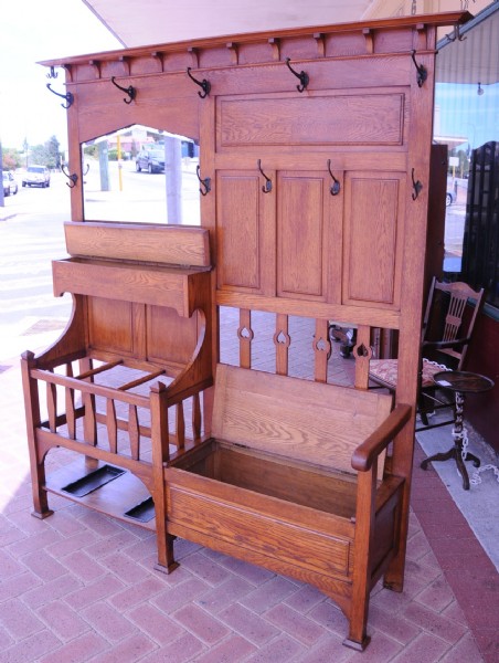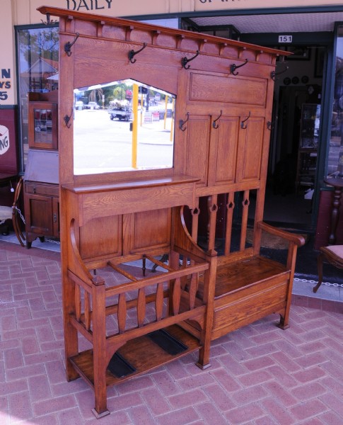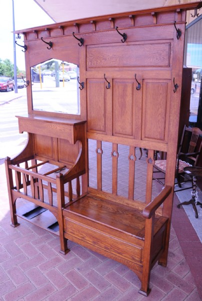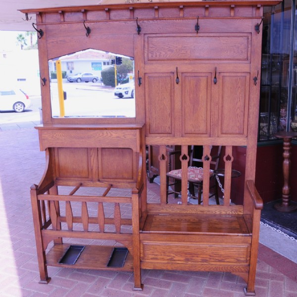 A large Oak Art Nouveau hallstand the moulded capping is supported by a series of brackets the beveled and fielded panel back with an arrangment of hooks and a small storage compartment over a walking stick and umbrella stand. To the right there is a seat that lifts up for storage that has heart shaped design to the slatted back. Raised on square legs with moulded skid’s. Size: 200cm high x 160cm wide x 43cm deep.
