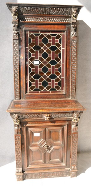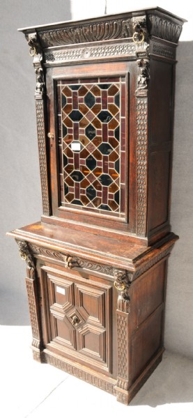 A late 19th Century oak lead glazed bookcase above a single drawer cupboard door base, highly carved with lion mask detail and brass ring drops. Size: 214 high x 90 wide x 54cm deep.