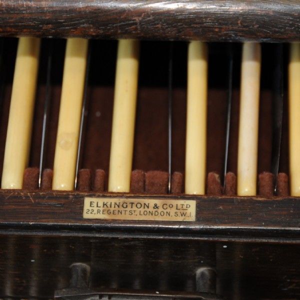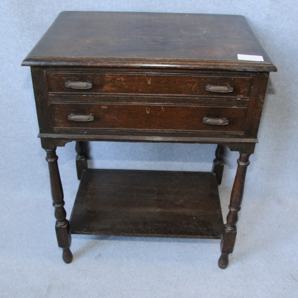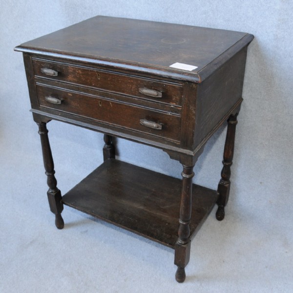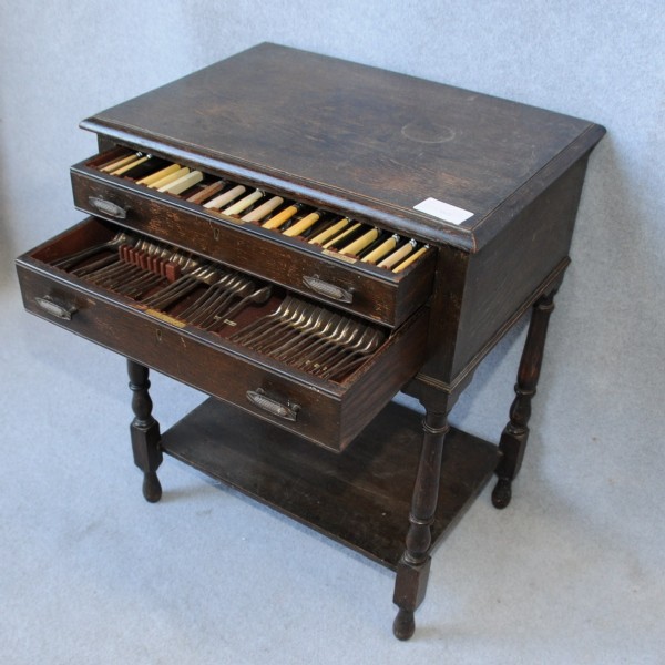 English oak cutlery cabinet, with a straight grain top and moulded edging. Second tier and turned legs. With makers plaque: Elkington & Co. Ltd, 22 Regents Street London. S.W.I. Size: 79 high x 64 wide 46cm deep.