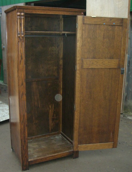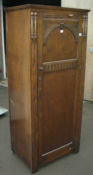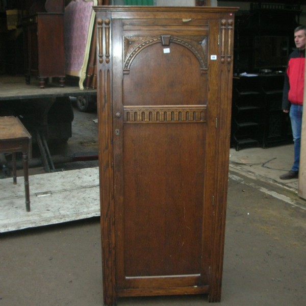 1930’s Oak Hallway Wardrobe. The carved arch door encloses a single shelf and hanging rail. The side rails with turned half columns and grooving.