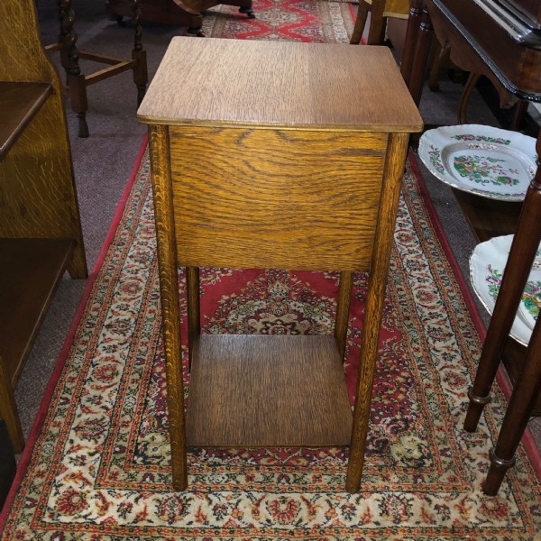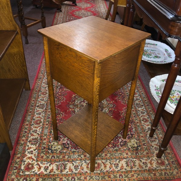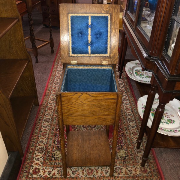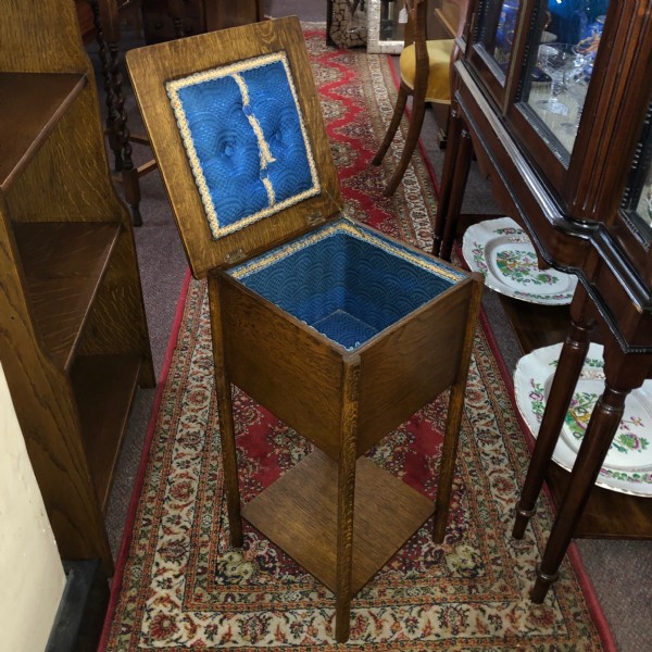 1930’s English Oak sewing box with a hinged lid that encloses a fabric lined interior, it has a handy bottom shelf and is raised on rounded legs.