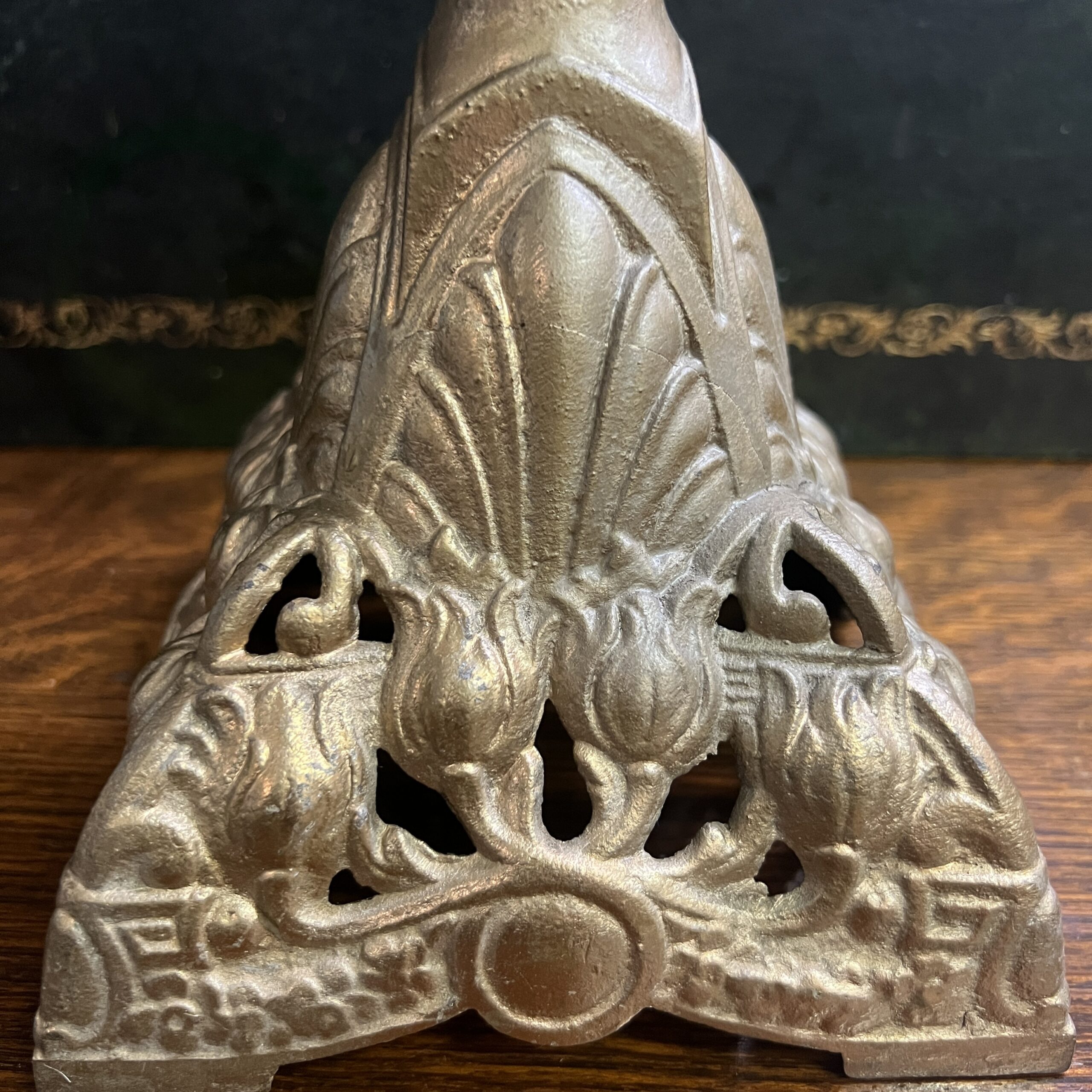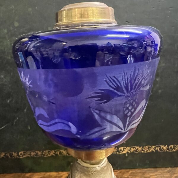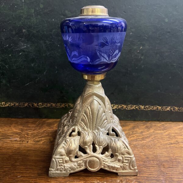 Vintage cast iron oil lamp base with modern cut glass blue reservoir