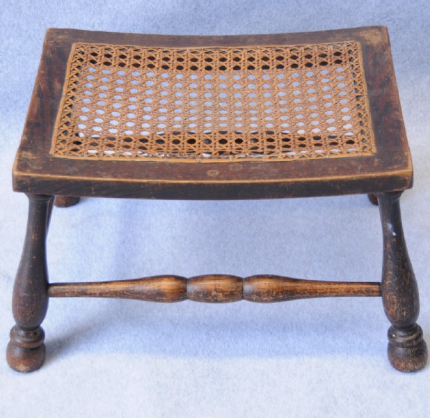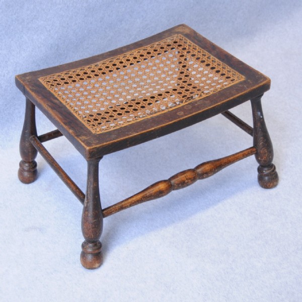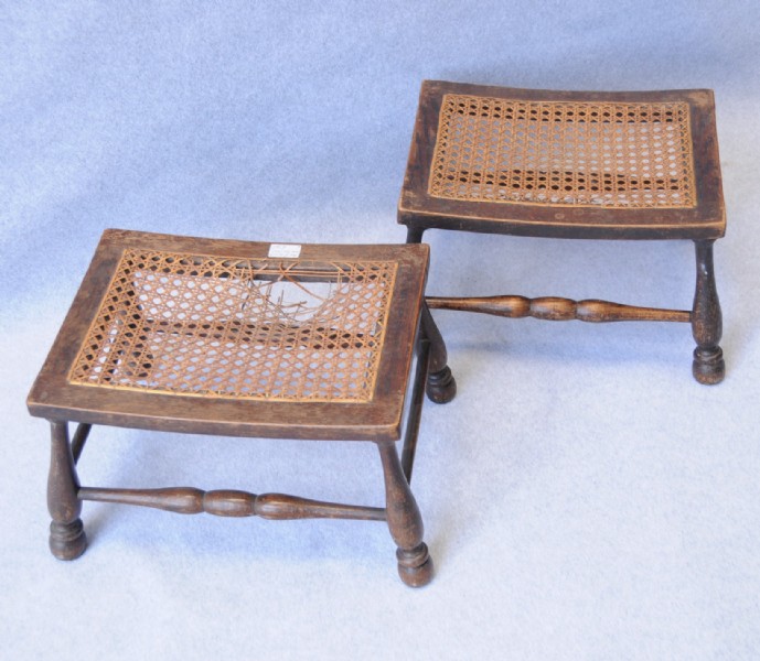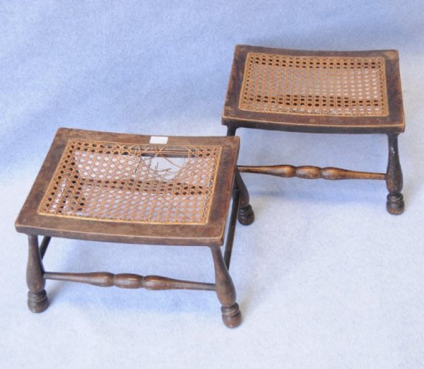 A pair of turned legged foot stools with rattan panel.