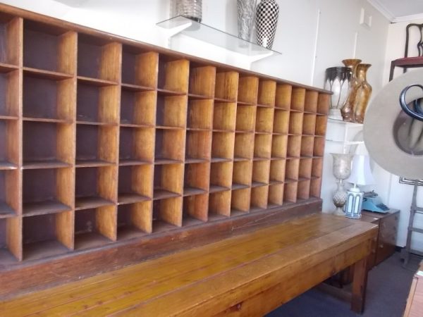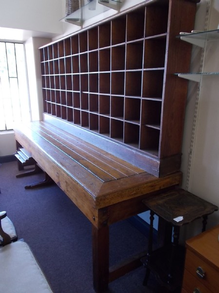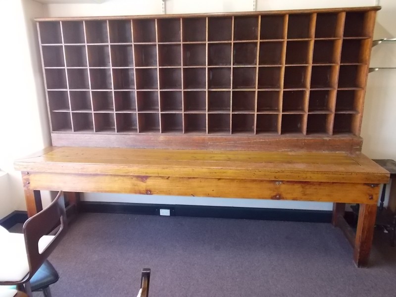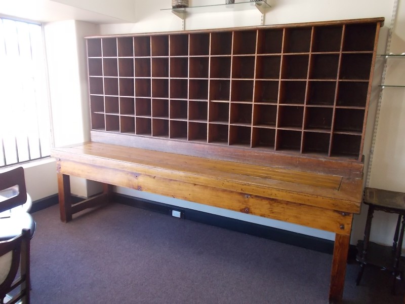 A postal mail sorting table from the Prahran Post Office in Melbourne. The top section with pigeonholes is 3010mm long x 1225 high x 260 deep