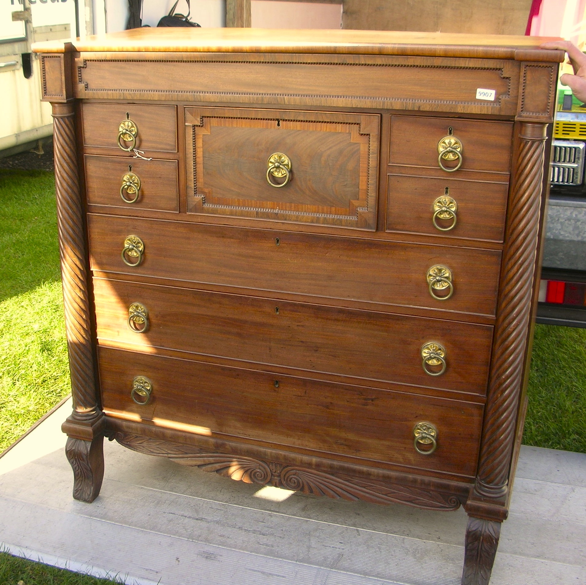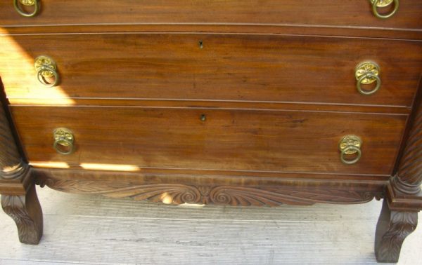 Attributed to a Scottish manufacturer “Trotter” this Mahogany chest is a beauty.  An arrangement of graduating drawers including a hat and secret draw both with beaded edges the hat drawer is cross banded.  Flanked on either side there are two rope twist columns over shaped front legs with acanthus leaf carving.  Spanning between the front legs is a shaped apron with scrolled carving.  All oak lined and having a full set of brass ring handles, all drawers constructed with hand cut dovetail joints.